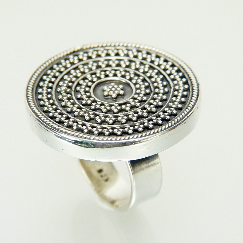 Ring aus 925/-er Silber mit geschwärzter Oberfläche, besetzt mit kleinen Silberkügelchen.
