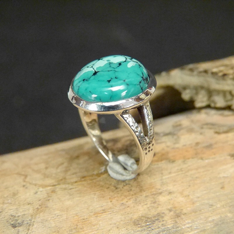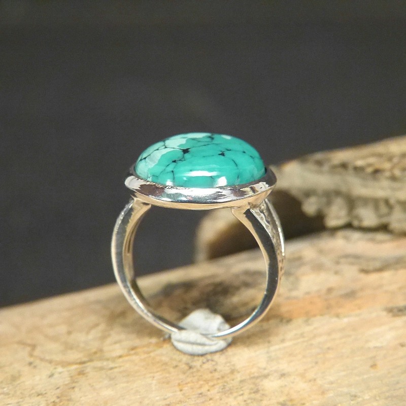 Silberring 925/- mit stabiler Schiene und eingefasstem schön marmoriertem Türkis mit einem Durchmesser von ca. 15mm.