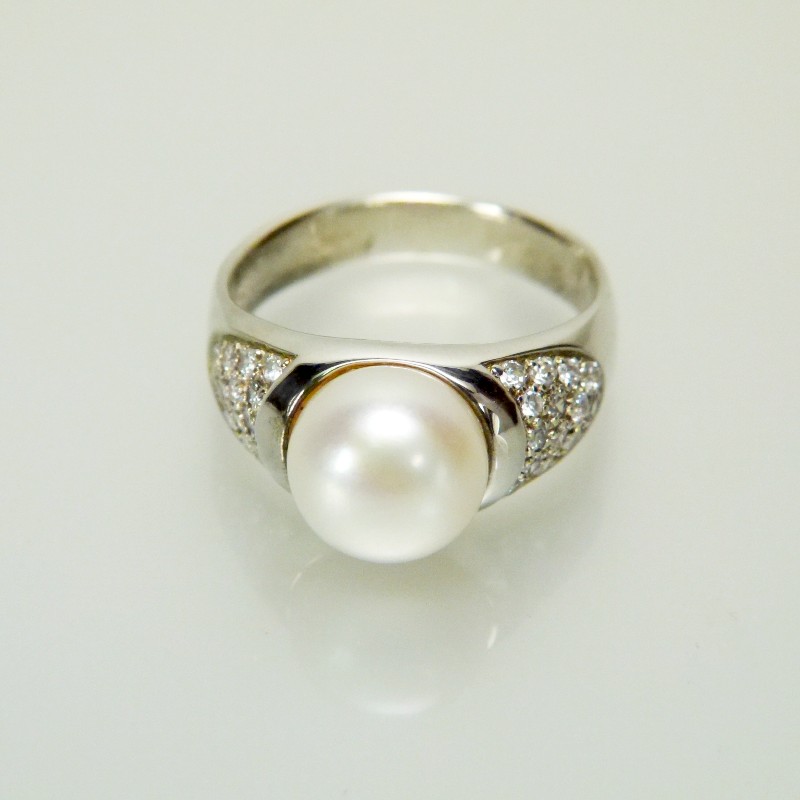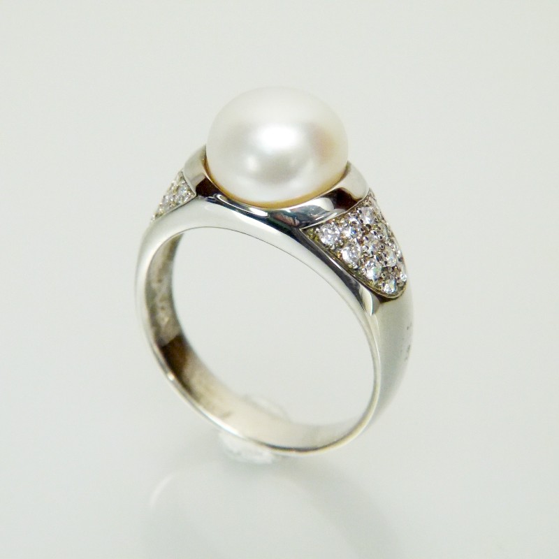 Klassischer Ring aus Silber 925/- mit eingefasster weißer Süßwasserperle, kombiniert mit Weißtopasen.