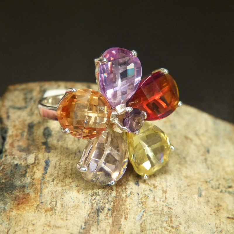 Farbenfroher Blütenring aus 925/-er Silber mit facettierten Zirkonia in Multicolor.