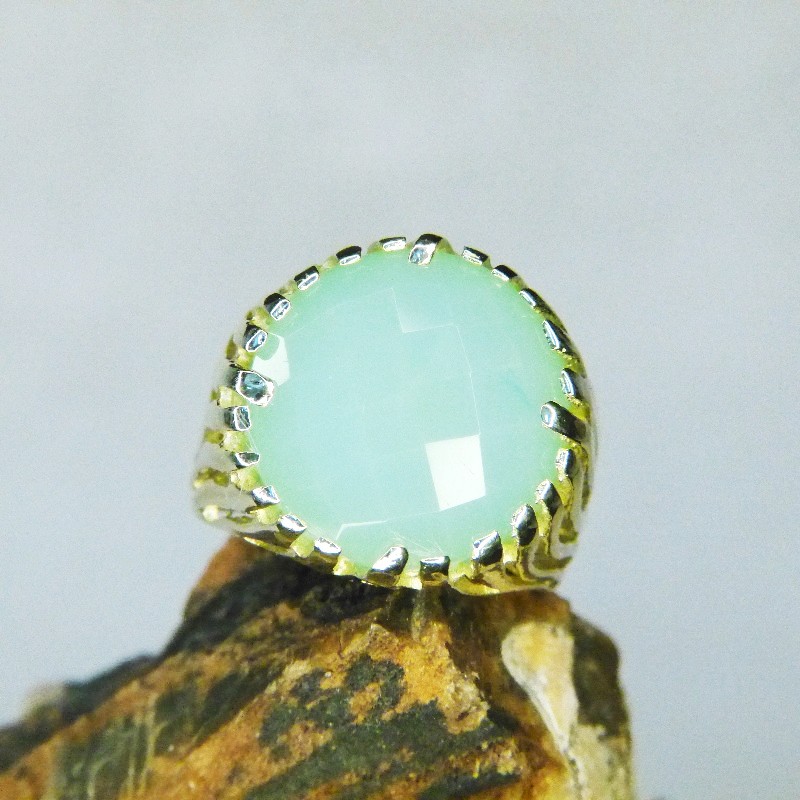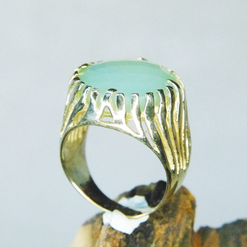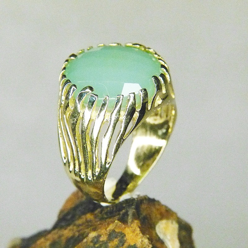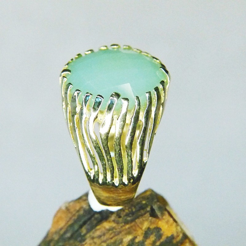 Schöner Ring aus vergoldetem 925/- Silber mit verspielten Ornamenten und einem grünlichen, facettiertem Chrysopras.