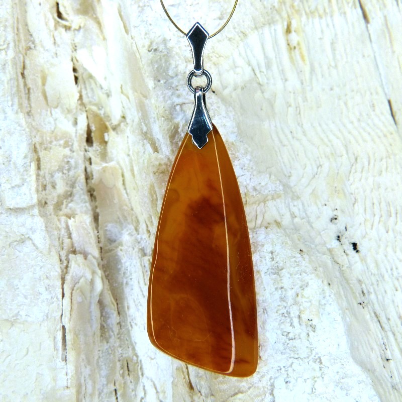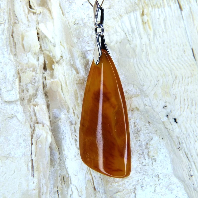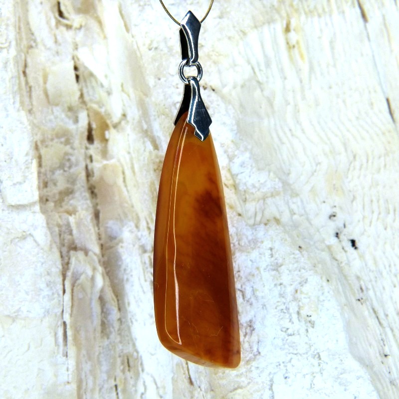 Länglicher Anhänger aus Naturbernstein mit dunkler gewolkter Färbung. Die Gesamtgröße ohne Öse beträgt ca. 47 x 20 x 7,5mm. Die Öse ist aus 835/-er Silber gearbeitet und eignet sich für Ketten bis ca. 2,5 mm Durchmesser.