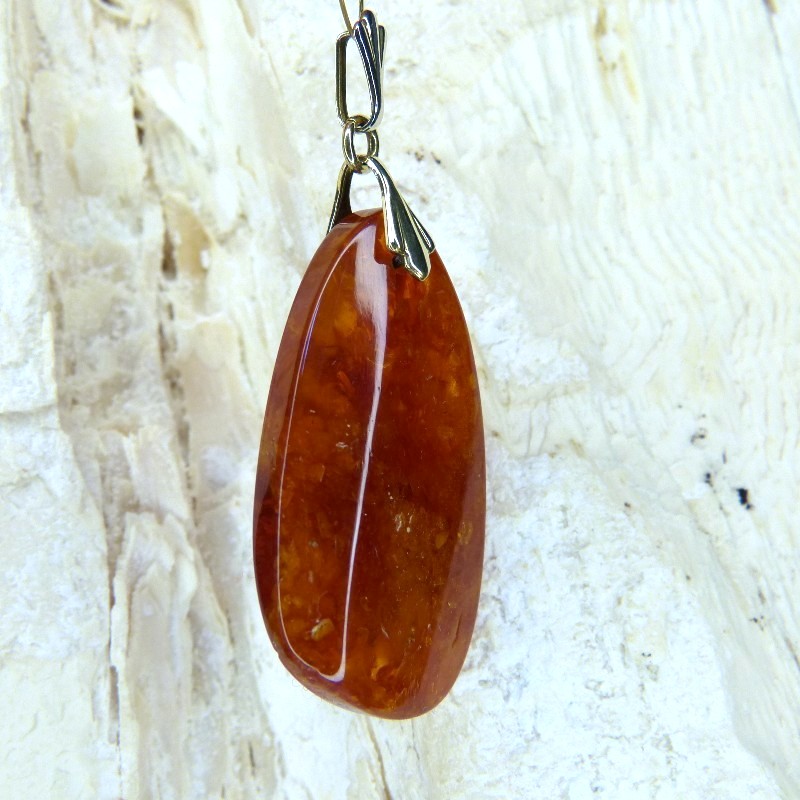 Anhänger aus dunklerem Naturbernstein mit unzähligen Einschlüssen. Die Gesamtgröße ohne Öse beträgt ca. 42 x 23 x 7,5mm.