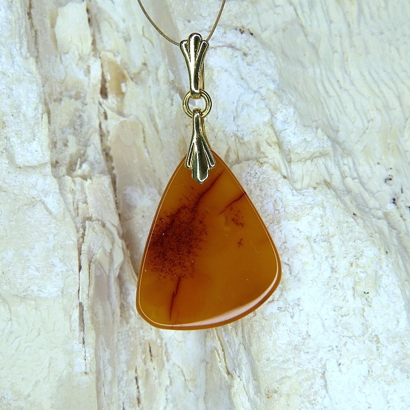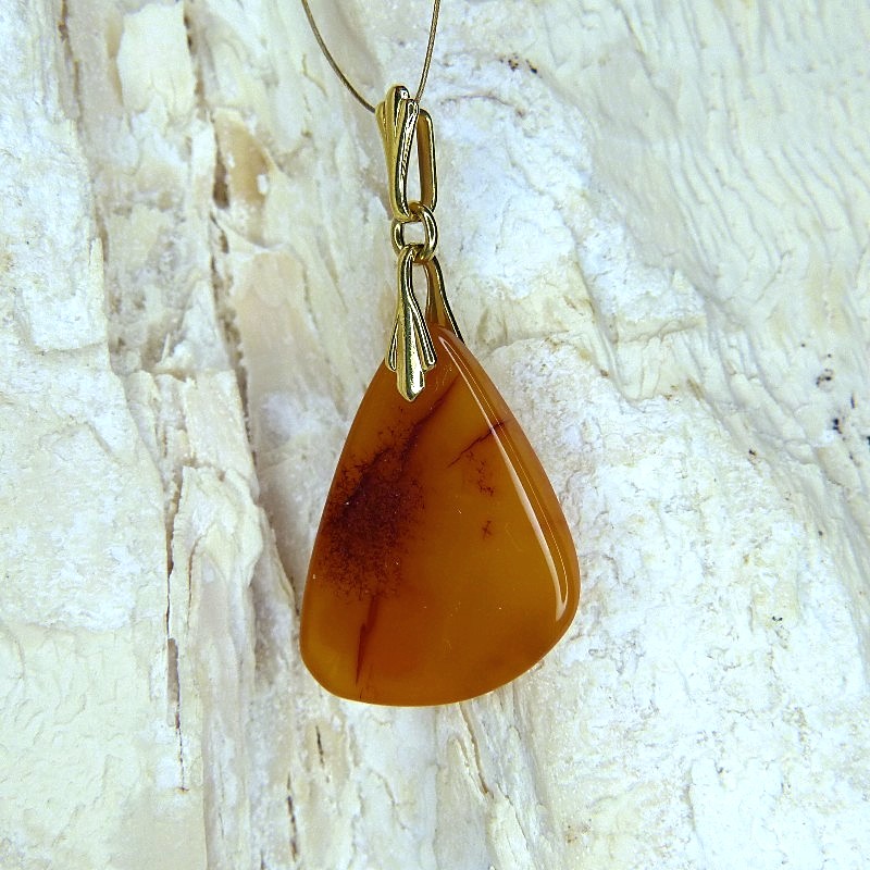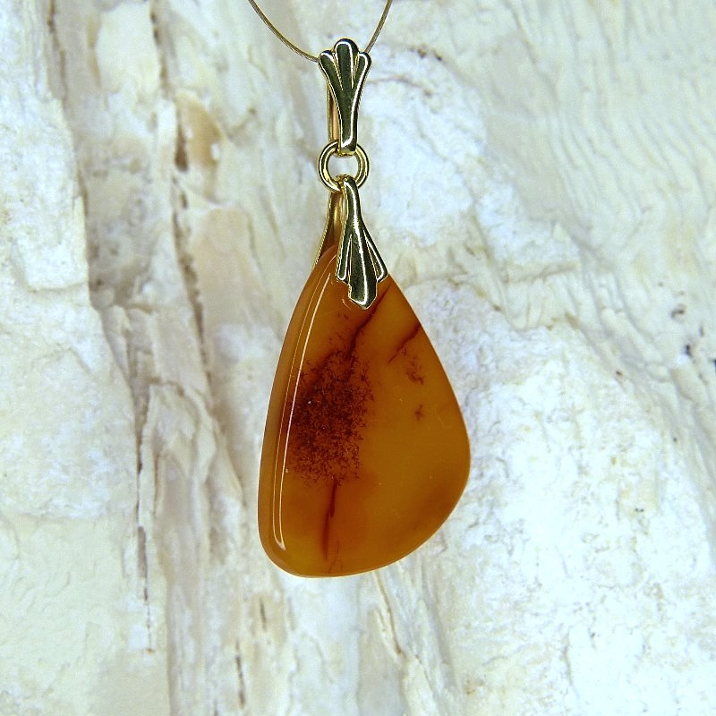 Flacher Anhänger aus leicht trübem Naturbernstein mit dunkleren inschlüssen. Die Gesamtgröße ohne Öse beträgt ca. 28 x 22 x 4mm.