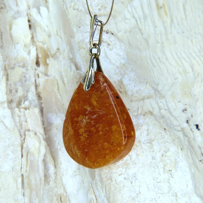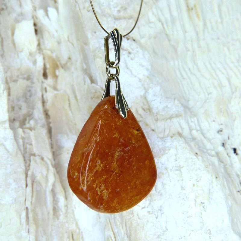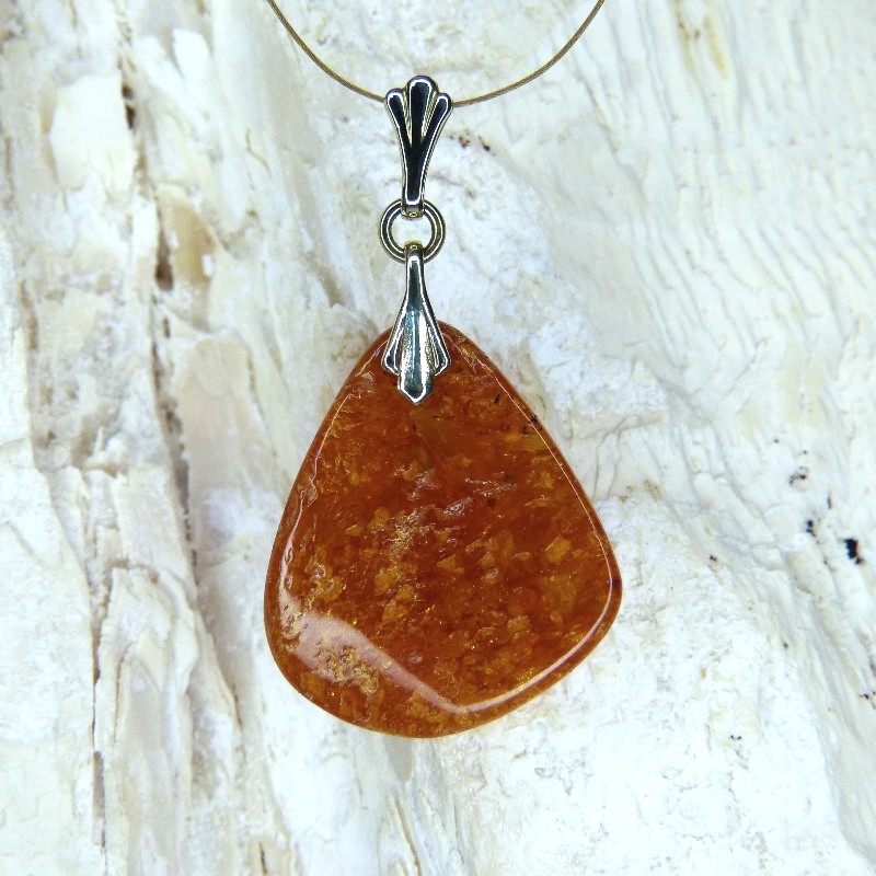 Anhänger aus grieseligem Naturbernstein in dunkler Cognacfärbung. Die Gesamtgröße ohne Öse beträgt ca. 29 x 25 x 7mm.
