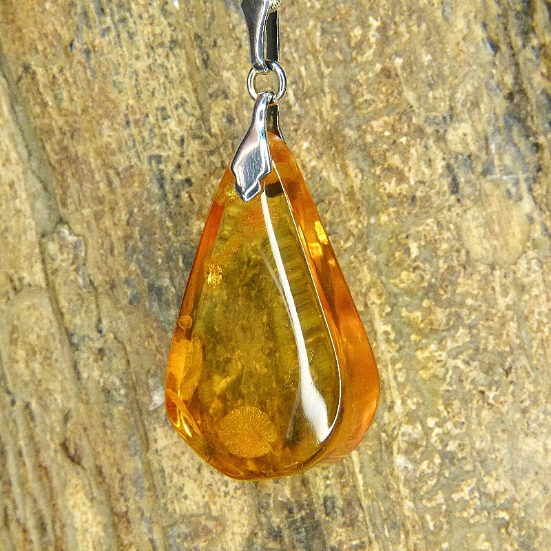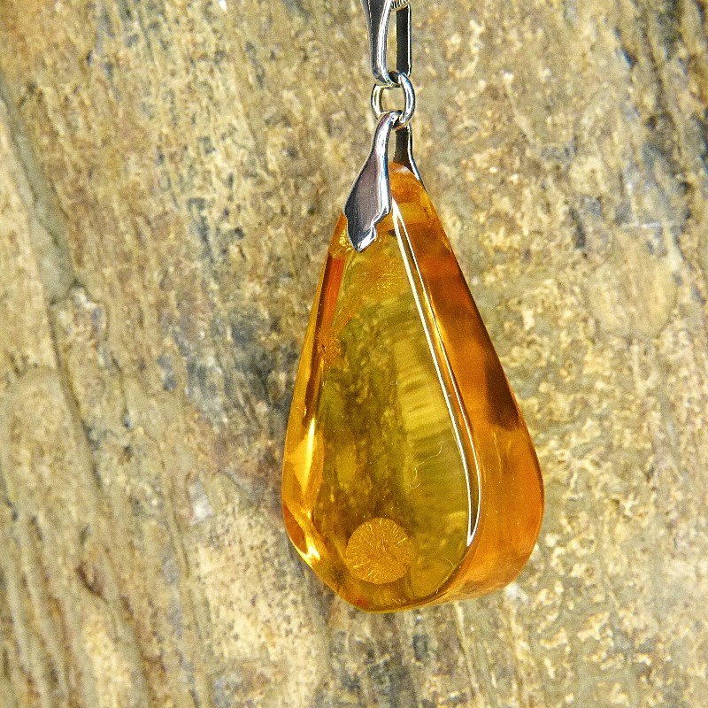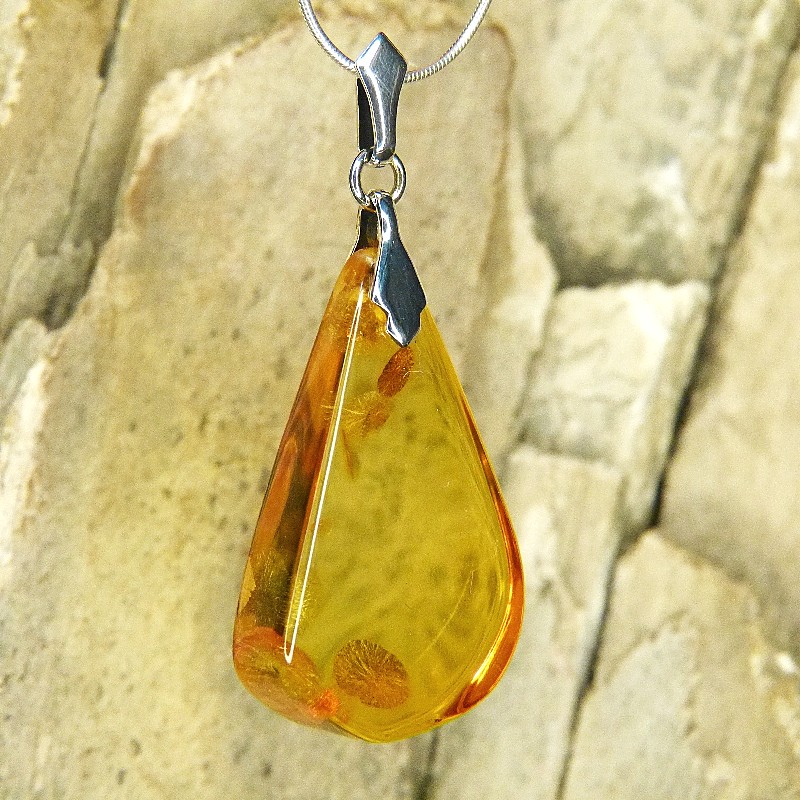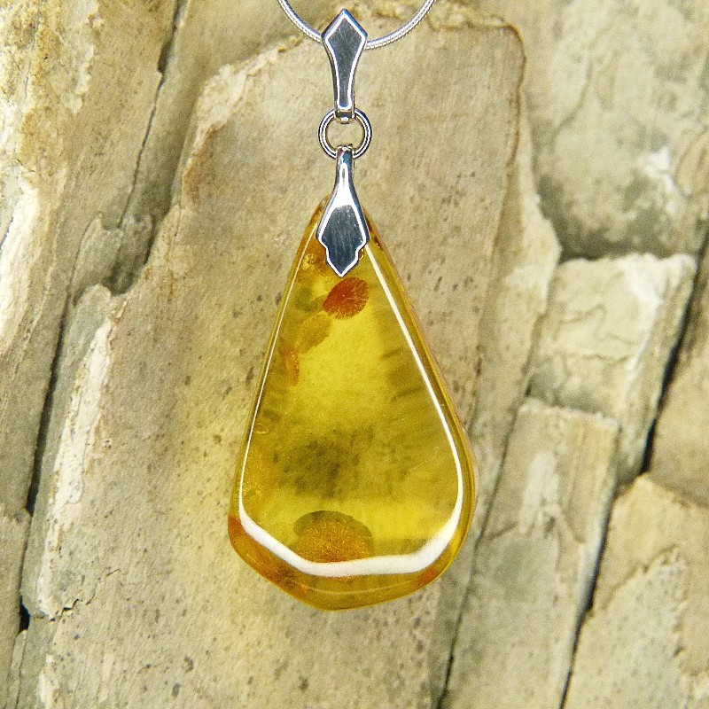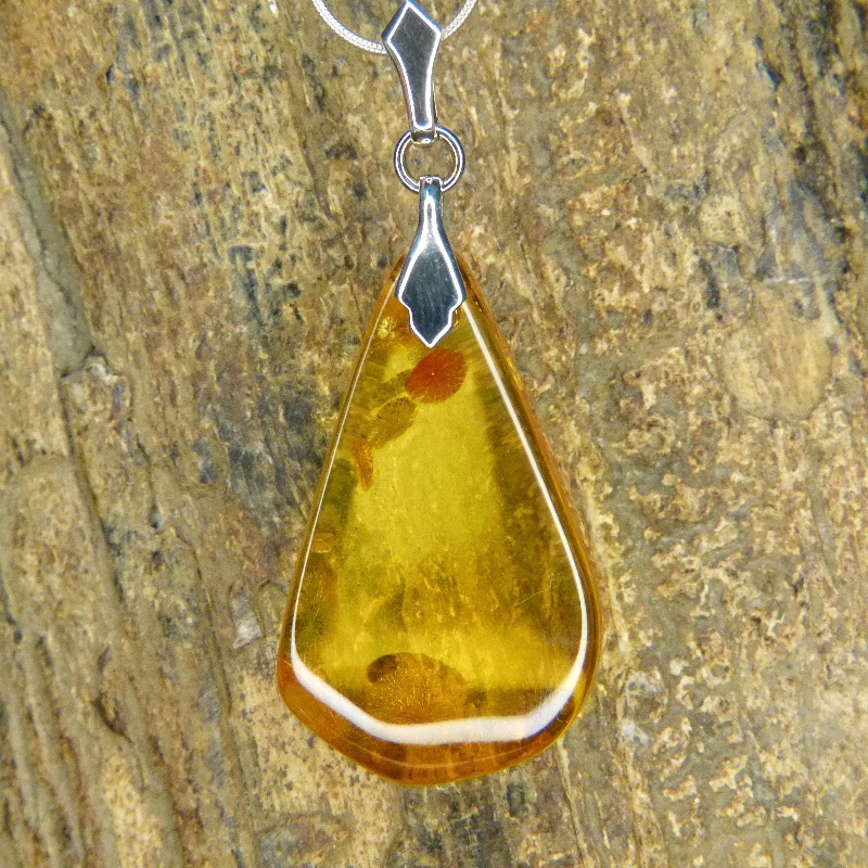 Klarer Anhänger aus Naturbernstein in hellgelber Färbung und einigen Sonnenflinten.