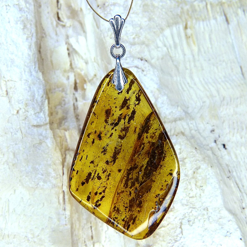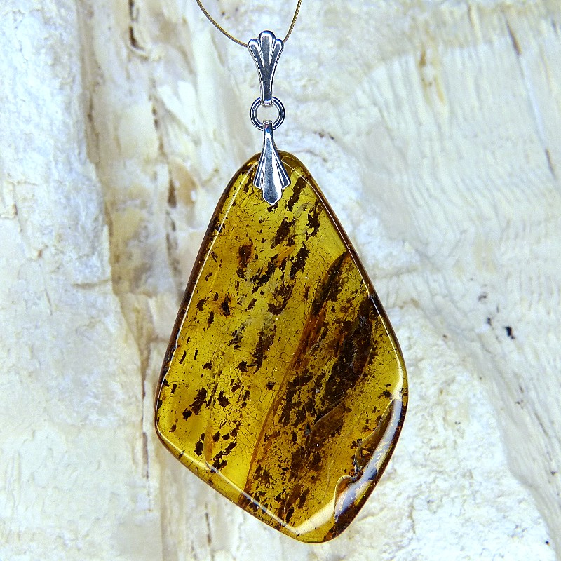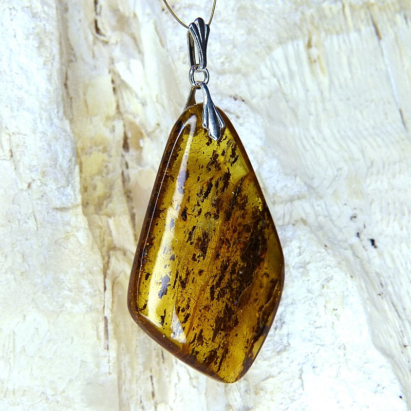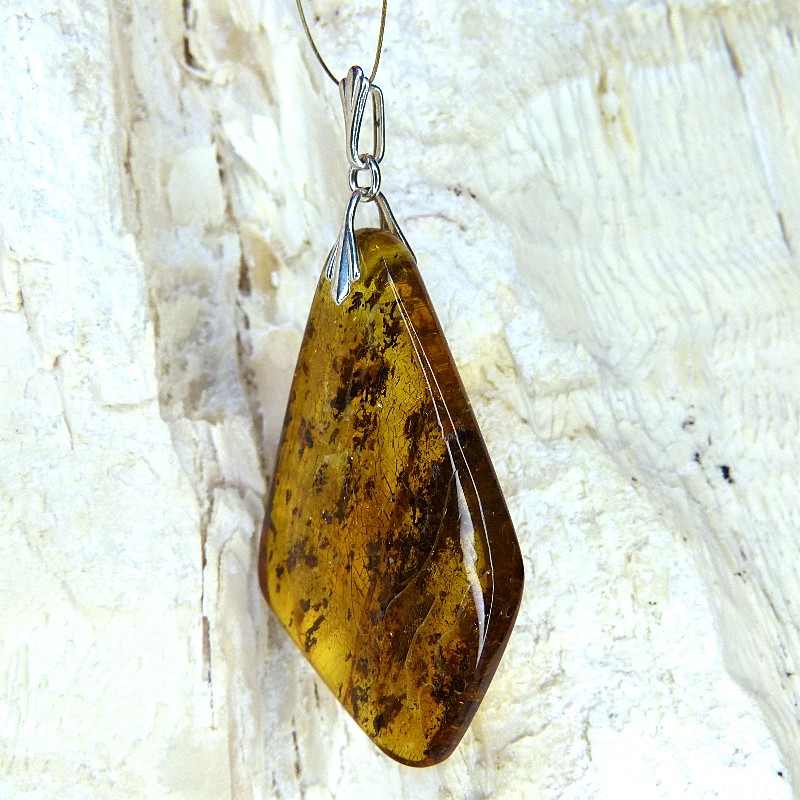 Anhänger aus Naturbernstein mit vielen kleinen Einschlüssen. Dieser Stein ist nach und nach aus mehreren Schichten Baumharz entstanden und wird auch Schlaubenstein genannt.
