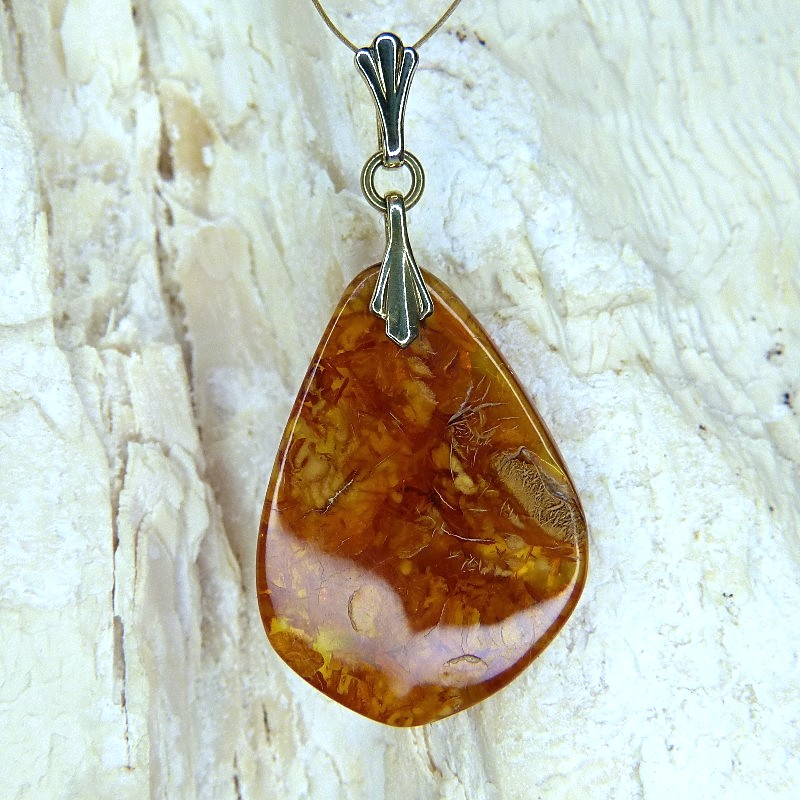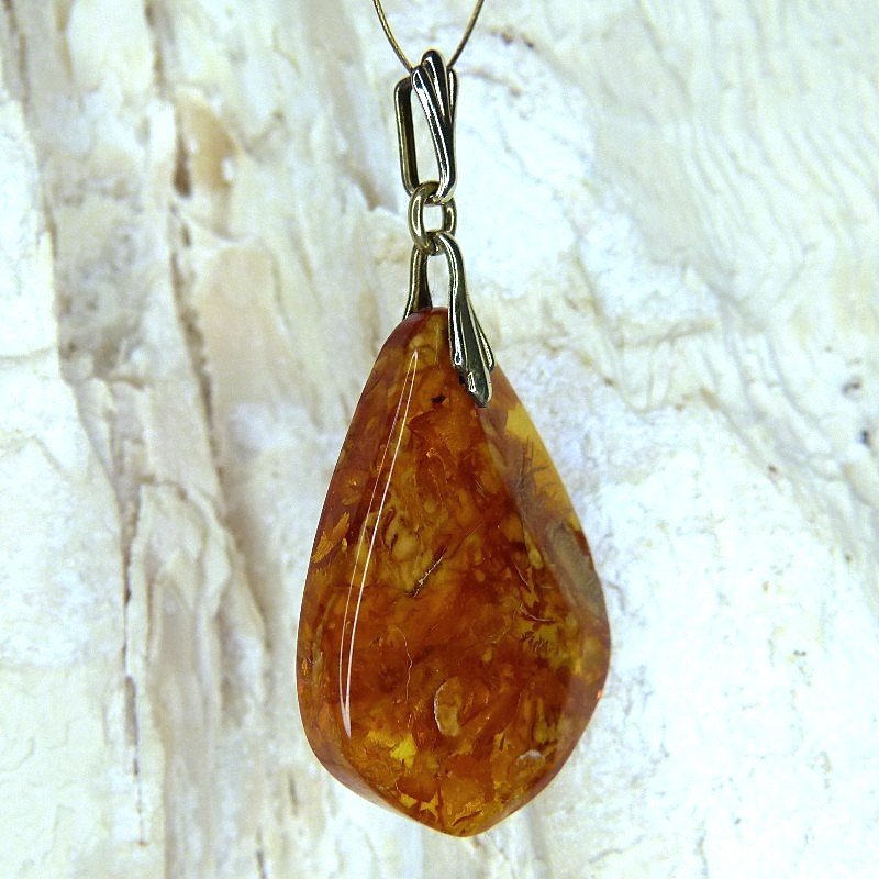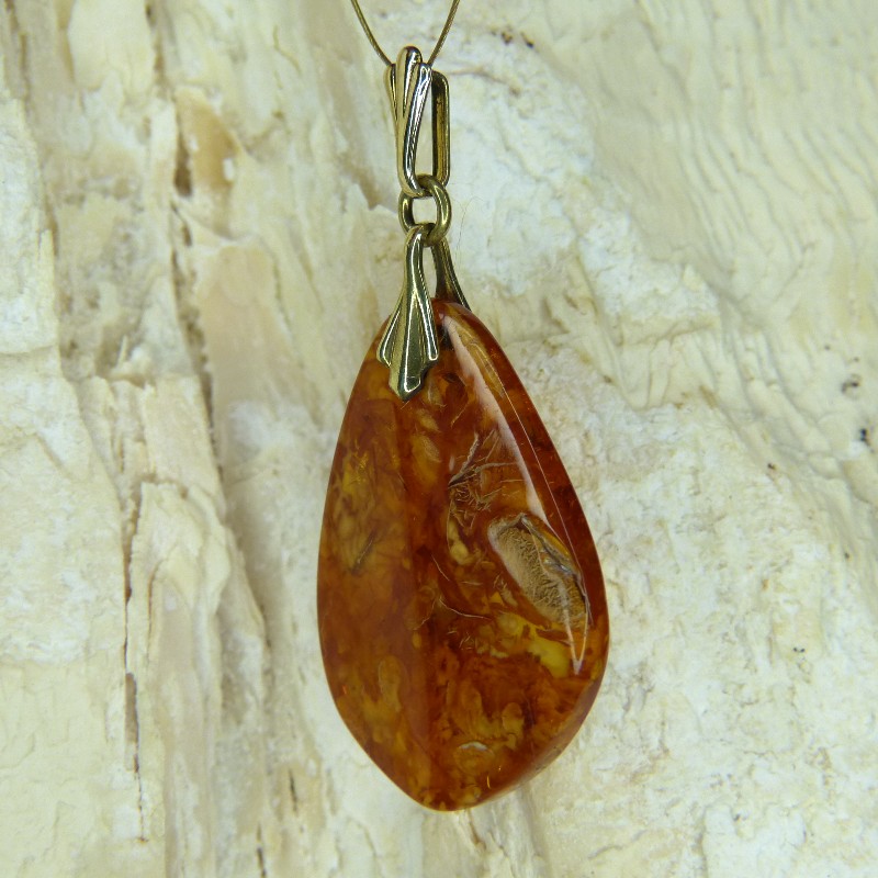 Anhänger aus kontrastreichem Naturbernstein mit schönen Einschlüssen. Die Gesamtgröße ohne Öse beträgt ca. 34 x 24 x 7mm.