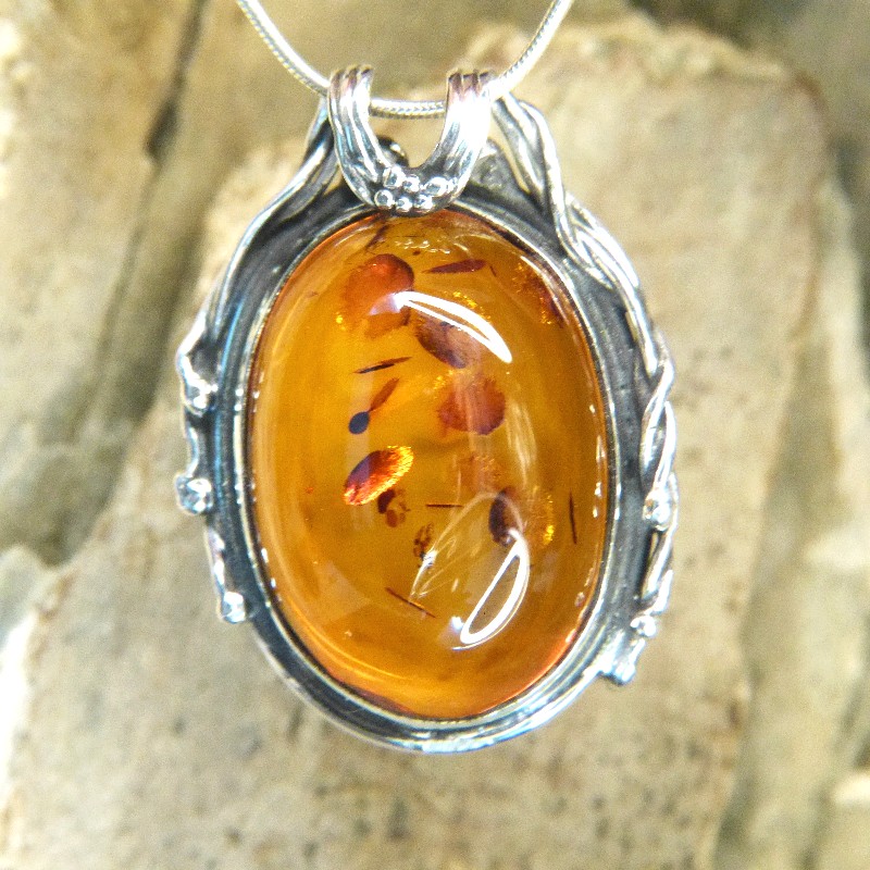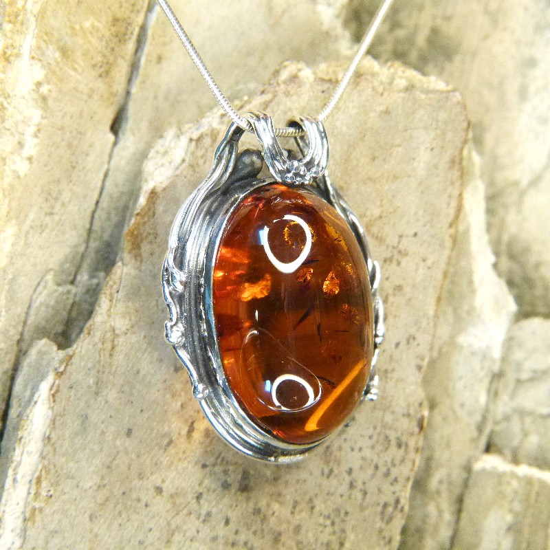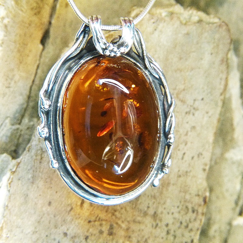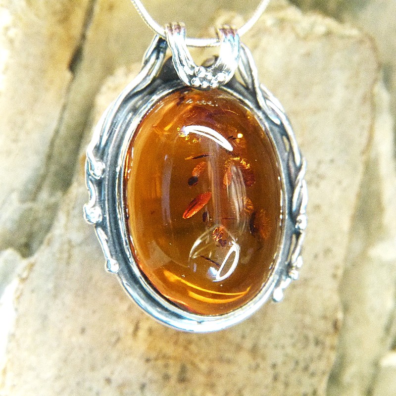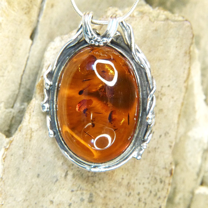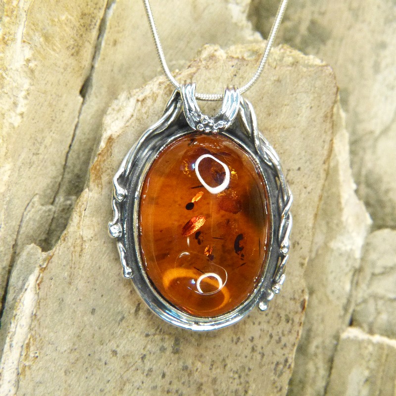 Silber-Anhänger 925/- mit einem ca. 24 x 18mm großen Naturbernstein in Cognacfärbung mit kleinen Sonnenflinten.