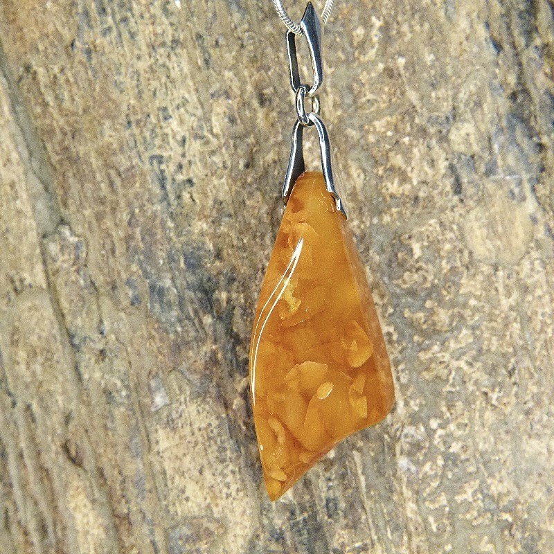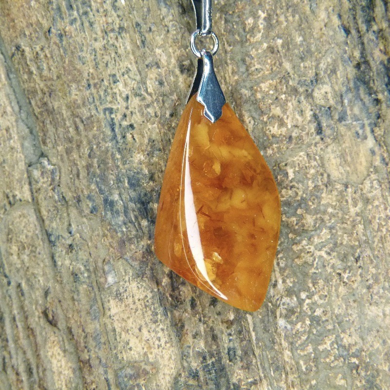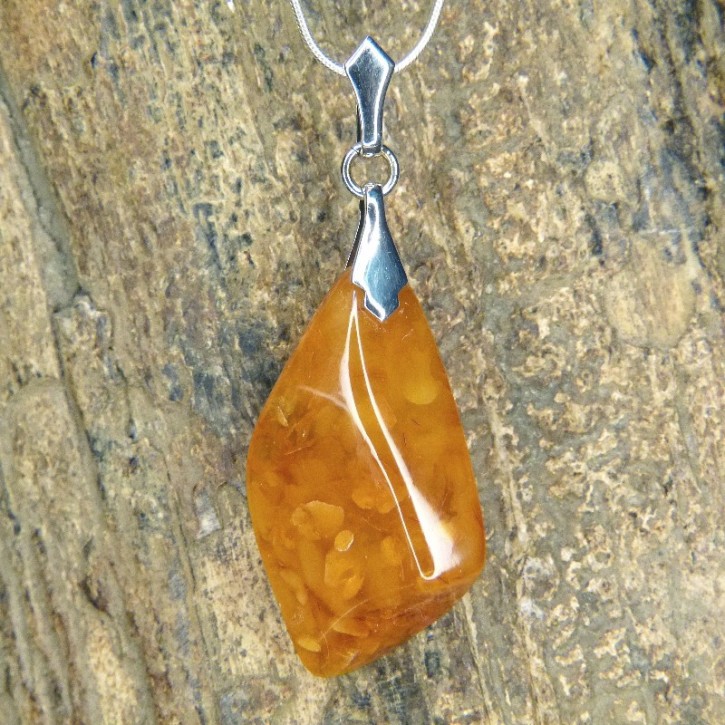 Anhänger aus Naturbernstein in oranger Färbung mit vielen Sonnenflinten.