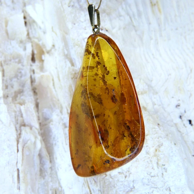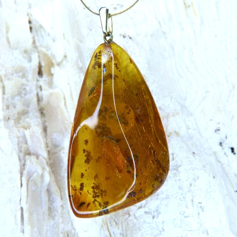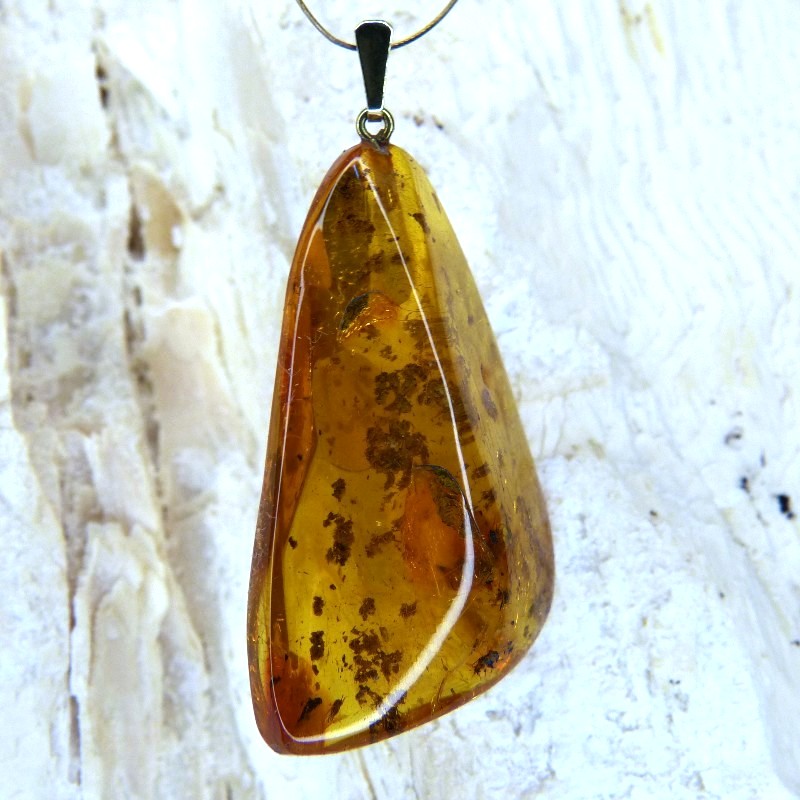 Anhänger aus Naturbernstein mit vielen kleinen Einschlüssen. Dieser Stein ist nach und nach aus mehreren Schichten Baumharz entstanden und wird auch Schlaubenstein genannt.