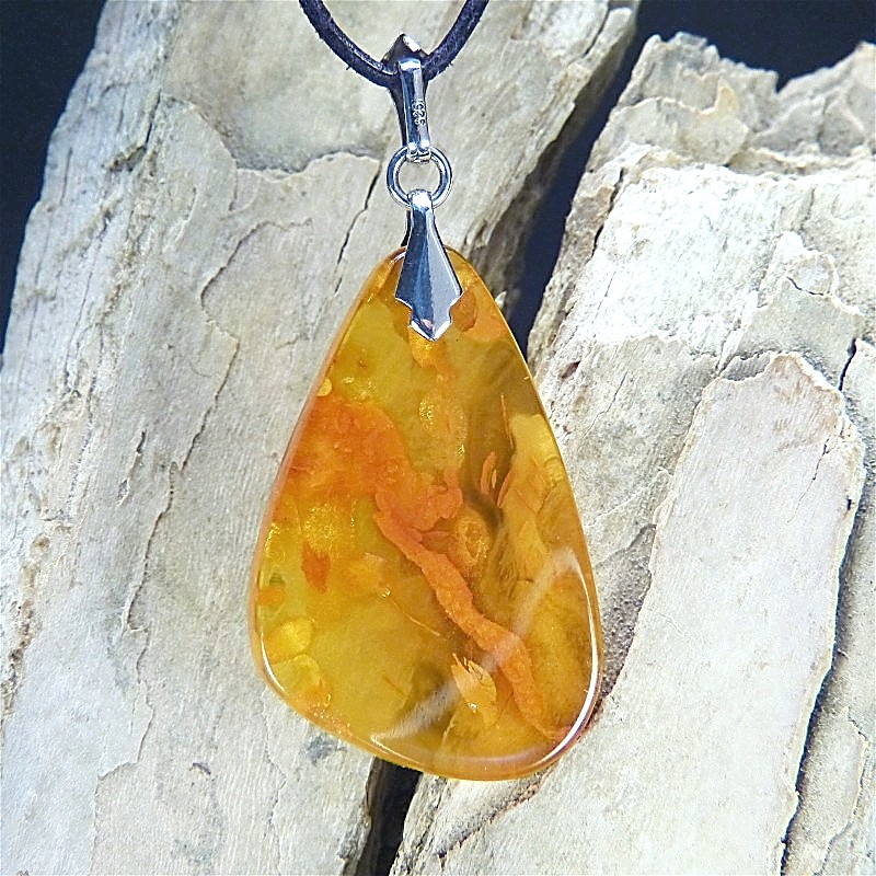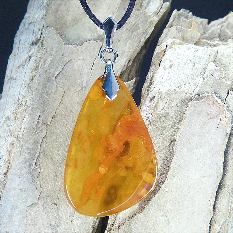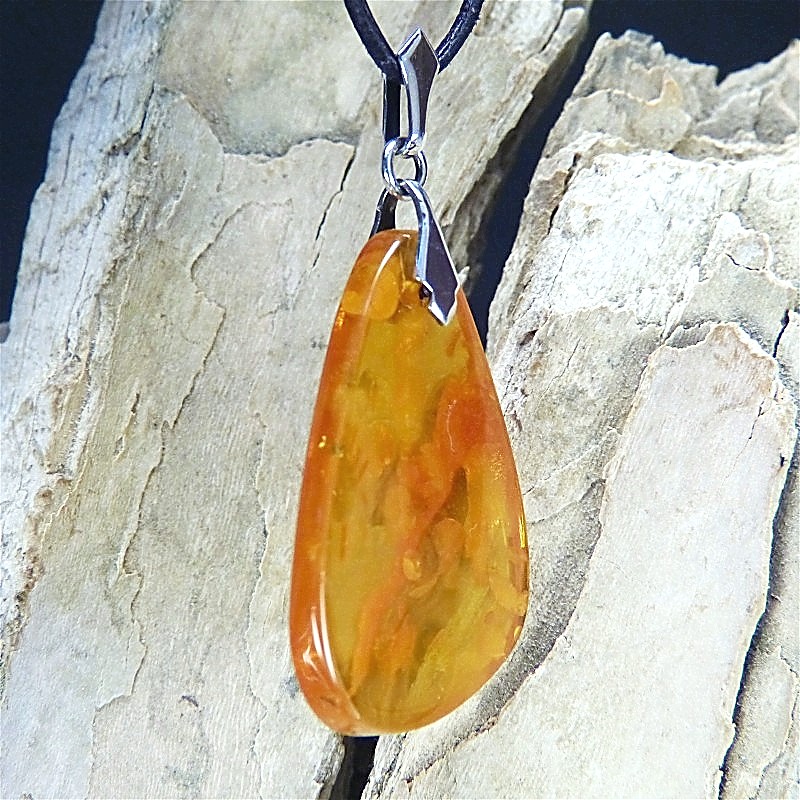 Flacher, aus Naturbernstein geschliffener Anhänger mit wolkigen Einschlüssen.