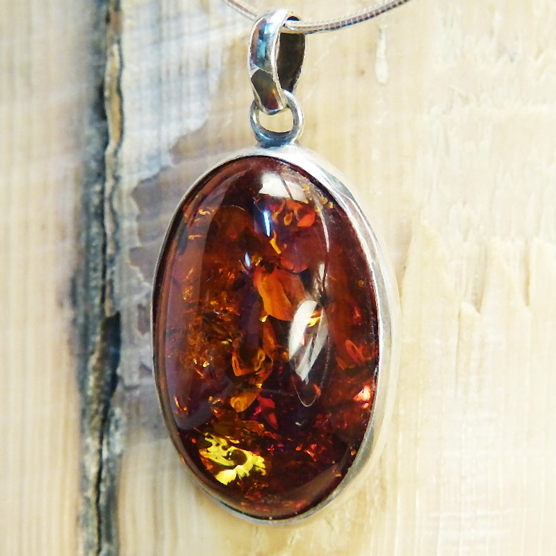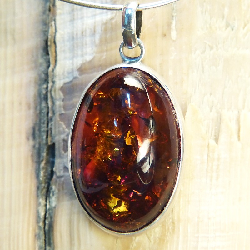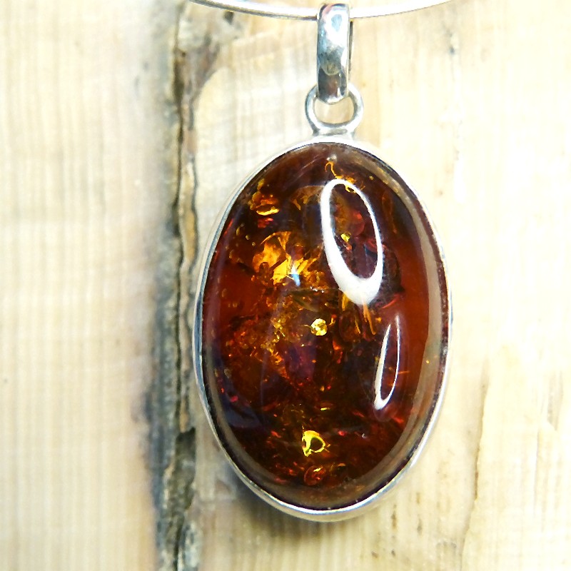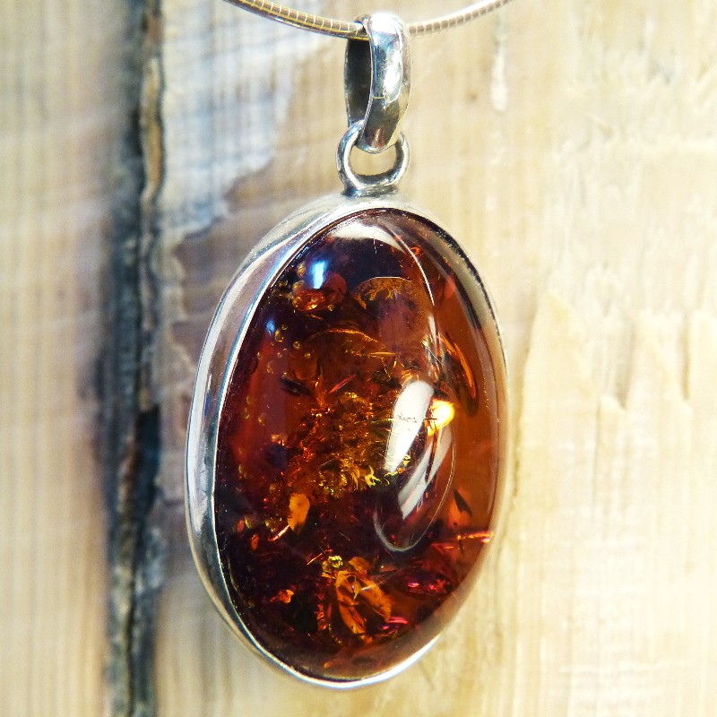 Anhänger aus 925/-er Silber mit einem dunkel cognacfarbenem Naturbernstein-Cabochon mit tollen Einschlüssen.