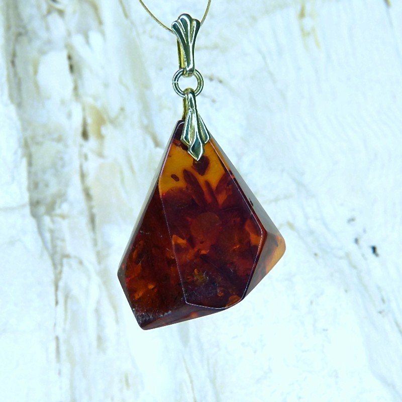Kantig geschliffener Anhänger aus dunklem Naturbernstein mit mehreren Sonnenflinten. Die Gesamtgröße ohne Öse beträgt ca. 30 x 27 x 21mm.