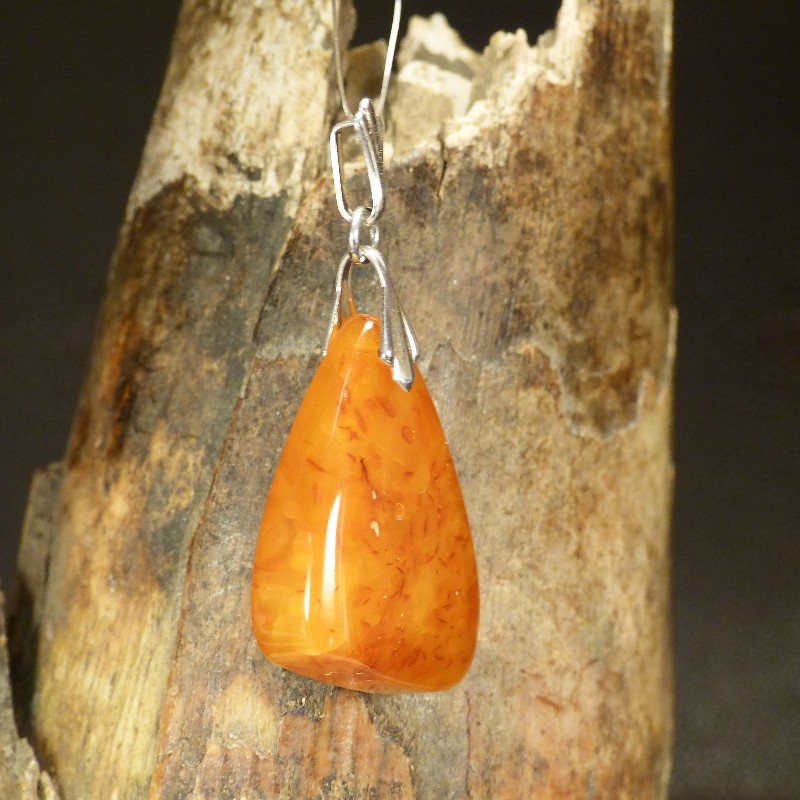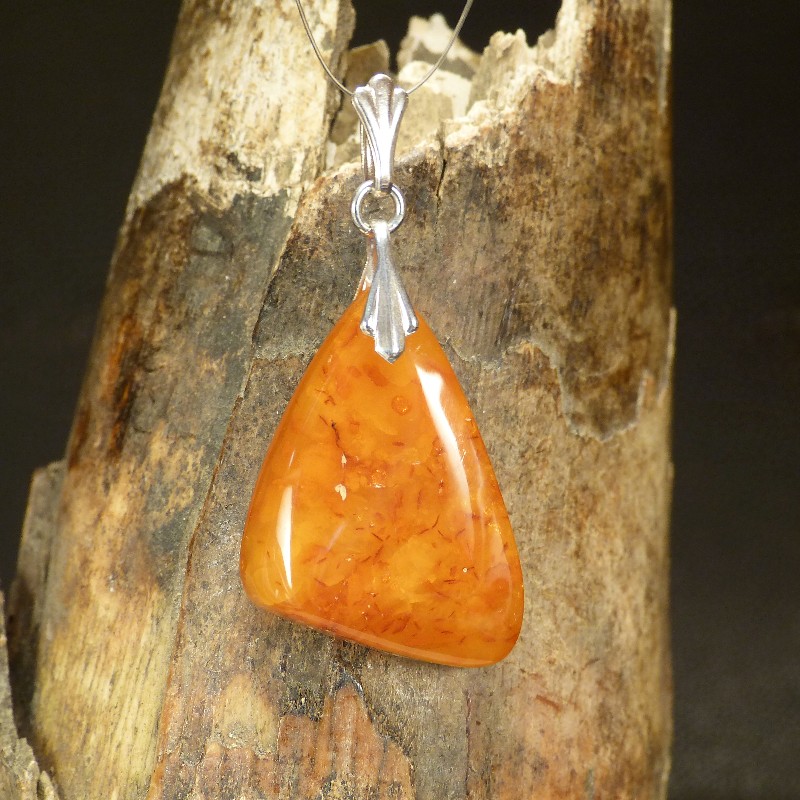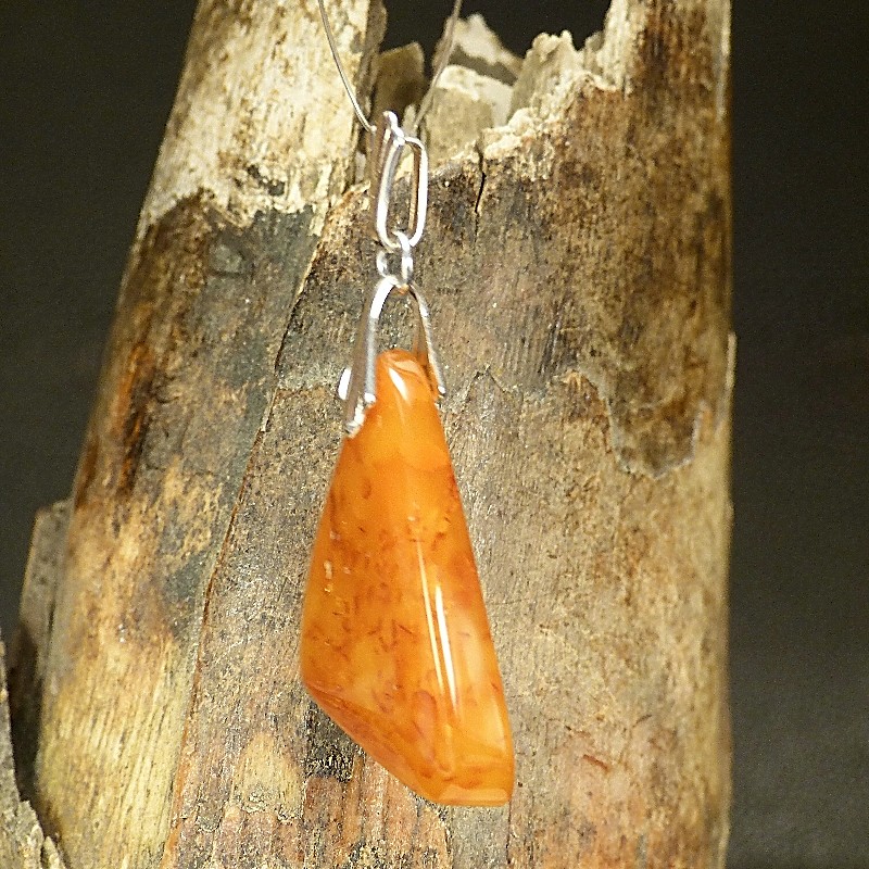 Kleiner Anhänger aus Naturbernstein in trüber Färbung. Die Gesamtgröße ohne Öse beträgt ca. 30 x 22 x 8mm. Die Öse ist aus 835/-er Silber gearbeitet und eignet sich für Ketten bis ca. 3 mm Durchmesser.