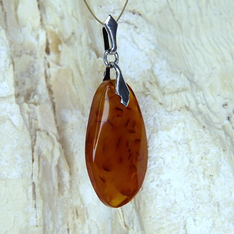 Kleiner Anhänger aus leicht trübem Naturbernstein mit mehreren Einschlüssen. Die Gesamtgröße ohne Öse beträgt ca. 32 x 19 x 5,5mm.