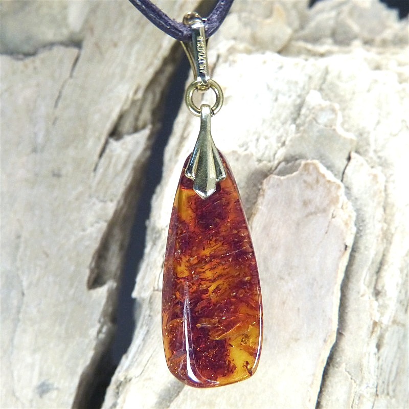 Kleiner, aus Naturbernstein geschliffener Anhänger mit vielen Einschlüssen.