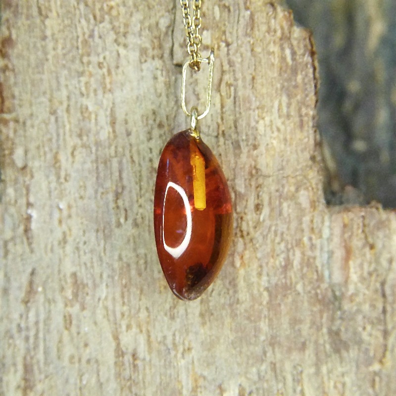 Kleiner, hinten abgeflachter Anhänger aus baltischem Naturbernstein mit dunkler Cognacfärbung in einer Größe von ca. 18 x 11mm.