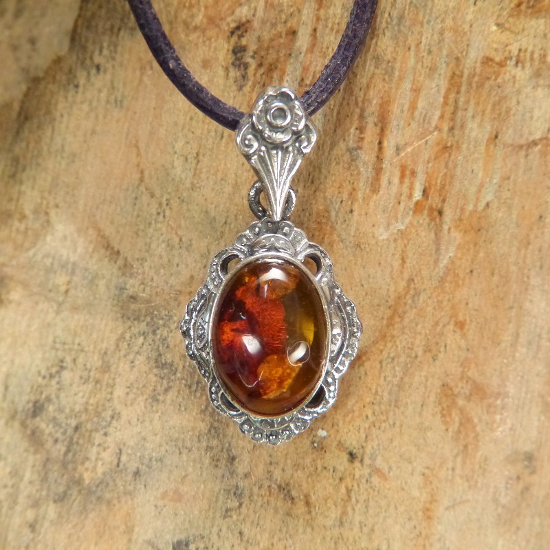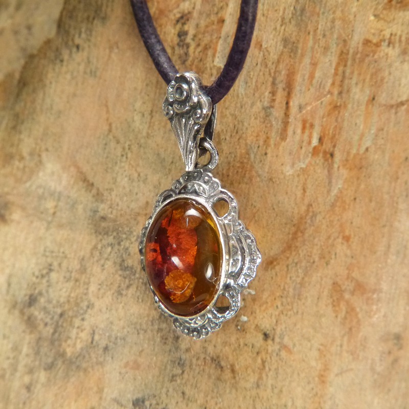 Kleiner Anhänger mit cognacfarbenem Naturbernstein, gefasst in einer soliden Fassung aus 835/-er Sterlingsilber in "Antik"-Optik. Die Öse eignet sich für Bänder oder Ketten bis zu einem Durchmesser von ca. 2,5 mm.