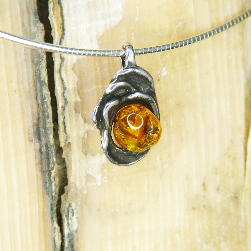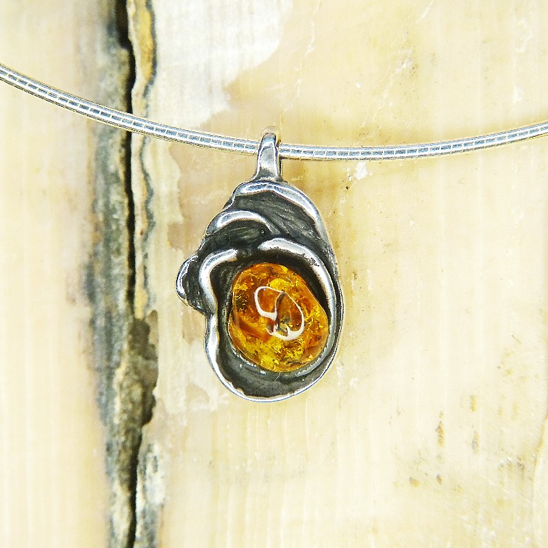 Kleiner verspielter Anhänger aus 925/-er Silber im antik Finish mit Naturbernstein gearbeitet.