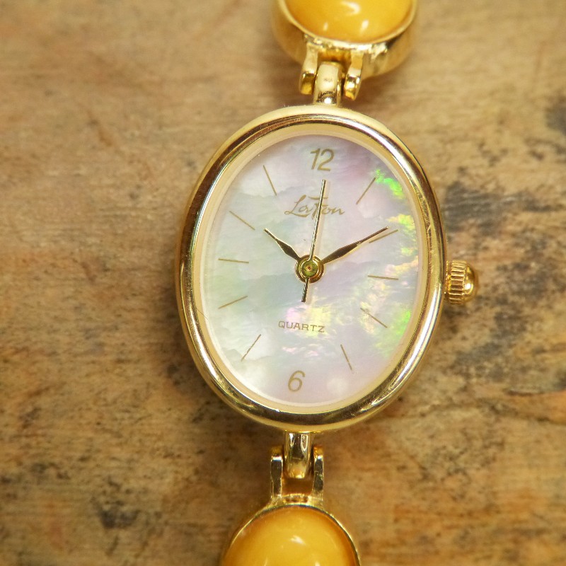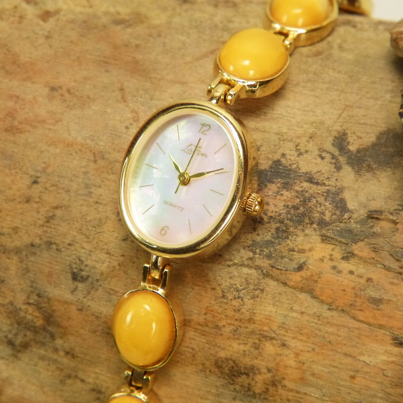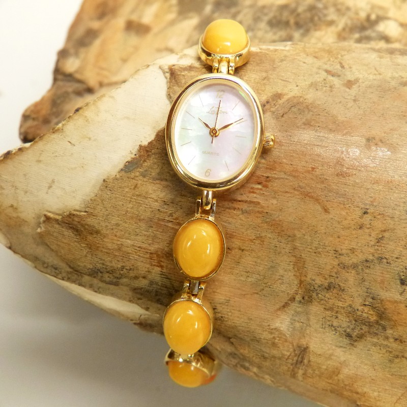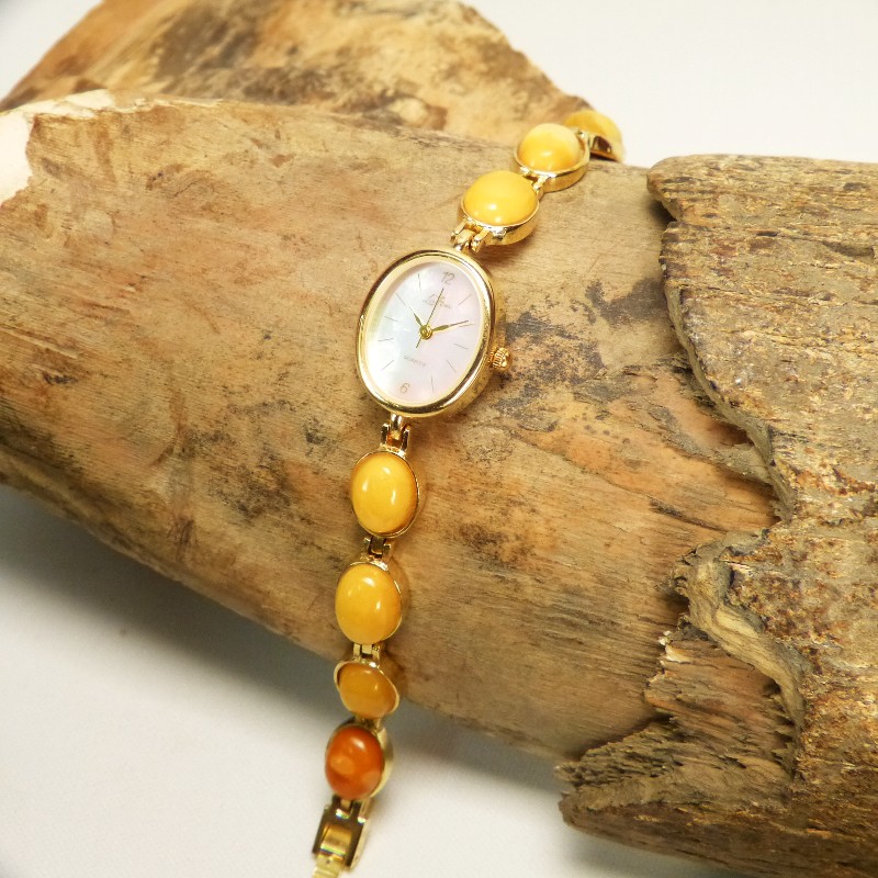 Armbanduhr mit einzelnen Gliedern, belegt mit 8 milchigen Naturbernstein-Cabochons.