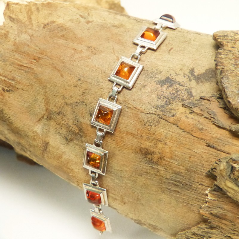 Armband aus 925/- Silber mit ca. 10 x 10 mm großen Elementen, besetzt mit Cabochons aus Naturbernstein in heller Cognacfarbe.
