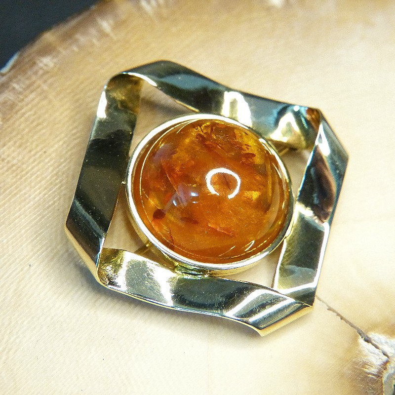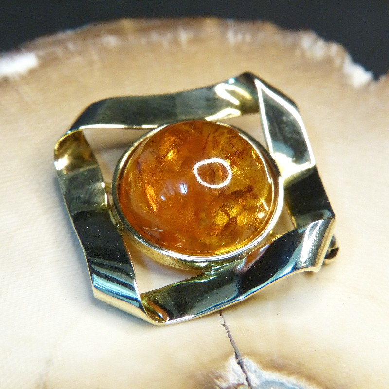 Brosche aus Gold 333/-, kombiniert mit einem eingearbeitetem, ca. 17mm großen Naturbernstein-Cabochon mit schönen Einschlüssen.