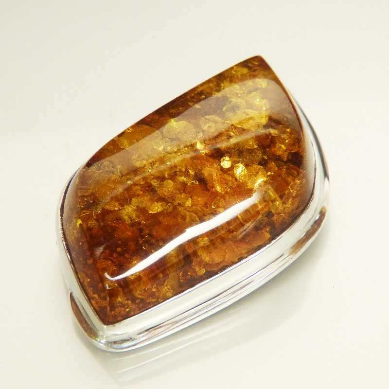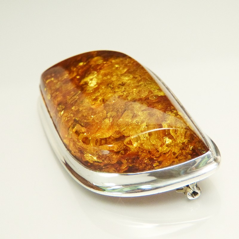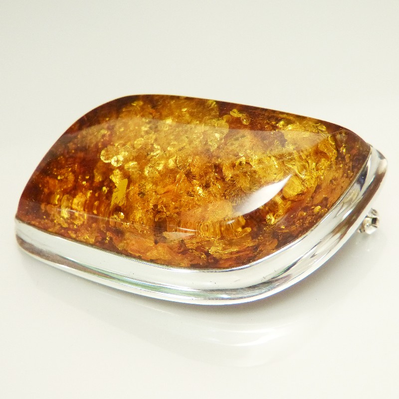 Große Anstecknadel aus 925/-er Silber mit einem cognacfarbenem Naturbernstein-Cabochon mit tollen Einschlüssen. Der Stein hat eine Größe von ca. 54 x 31mm und wird von einer schlichten Fassung mit rückseitig montierter Nadel und einem Sicherheitsverschluss gehalten.