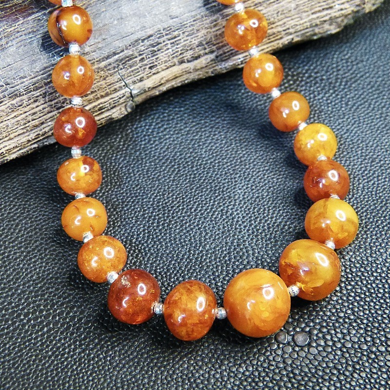 Naturbernsteinkette, bestehend aus rundlichen, von Hand geschliffenen Kugeln mit einem Durchmesser von ca. 16 mm in der Mitte, verlaufend bis auf ca. 8 mm am Ende.