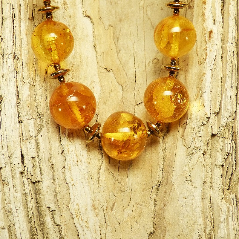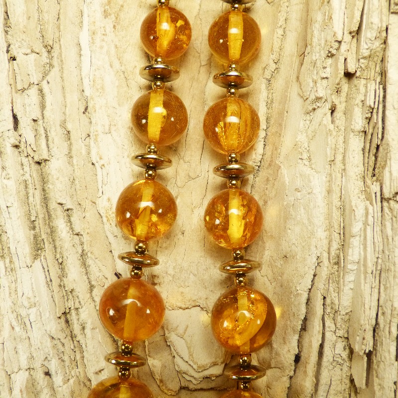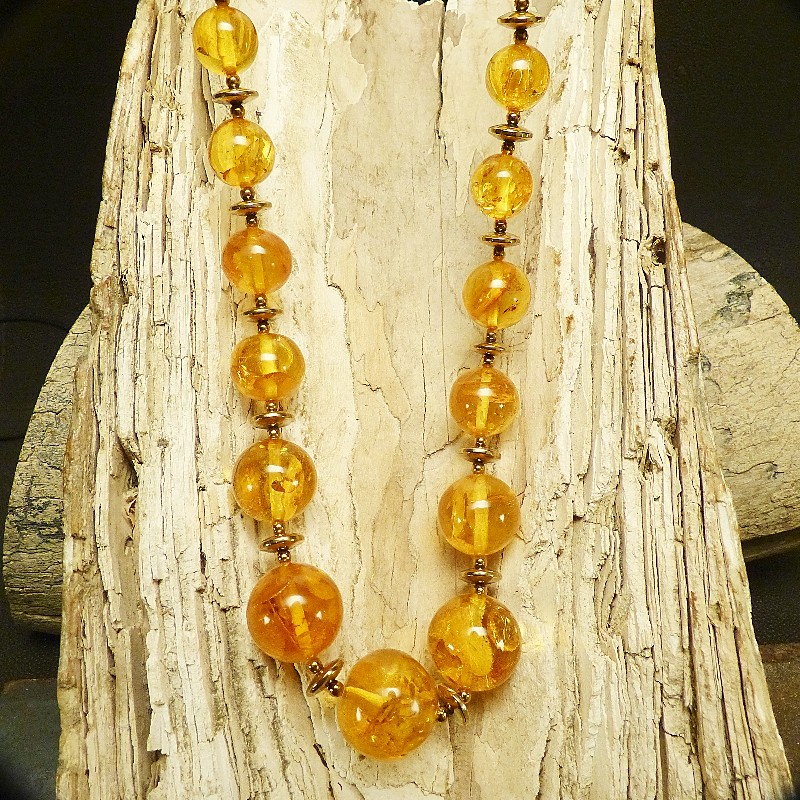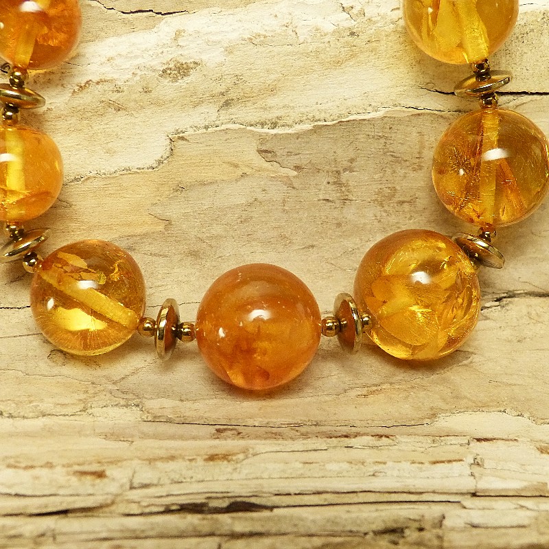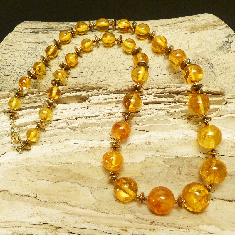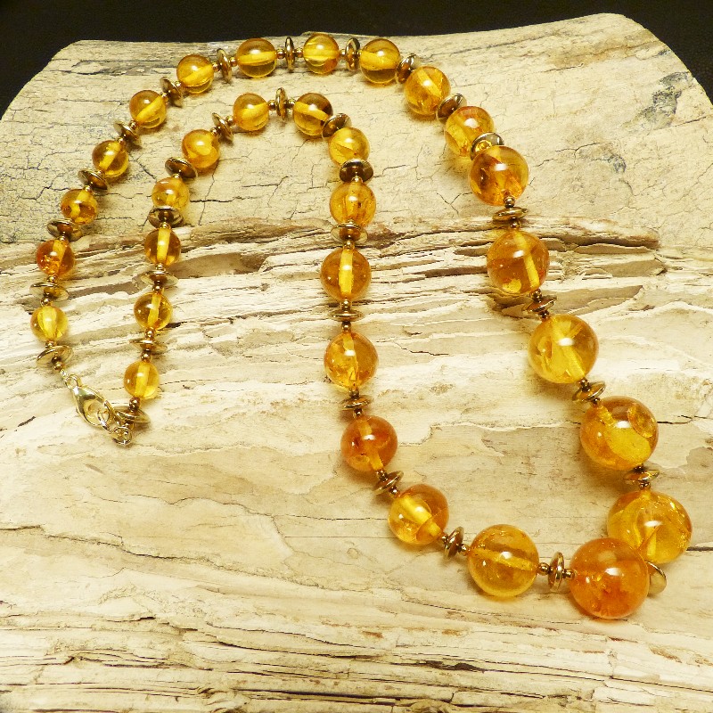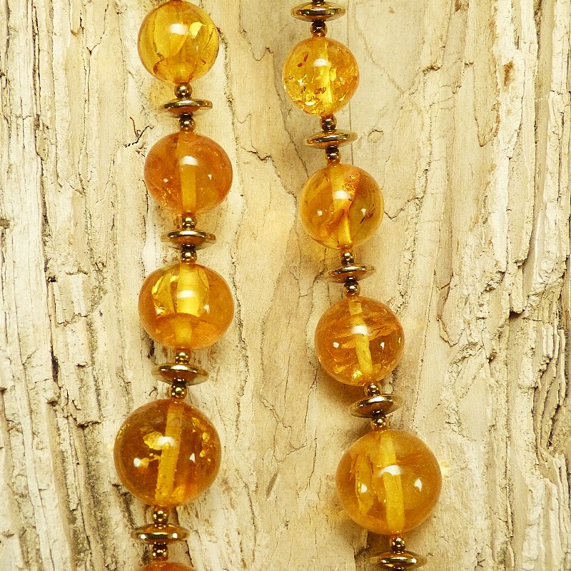 Cognacfarbene Kugelkette aus Naturbernstein mit Zwischenelementen aus goldfarbenem Hämatit. Die Kette misst in der Mitte ca. 21mm und verjüngt sich am Ende bis auf ca. 9,5 mm. Aufgereiht auf einem mehrfach gedrehtem Stahldraht und einem Karabiner aus goldplattiertem 925/-er Silber wird die Kette sicher gehalten. Gesamtlänge ca. 72cm.