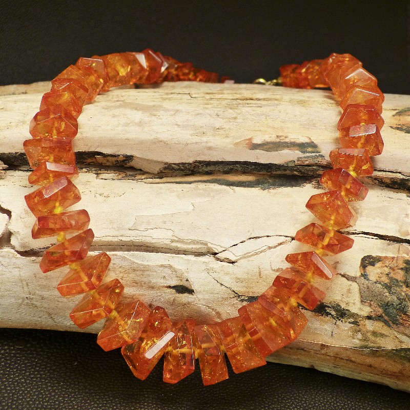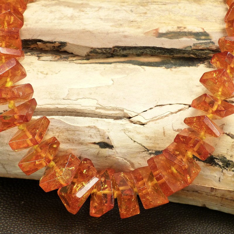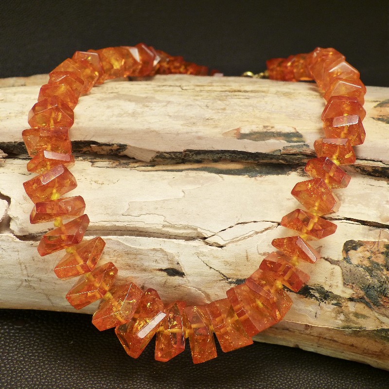 Kantig geschliffene Kette aus cognacfarbenem Naturbernstein mit vielen Einschlüssen. Die einzelnen Elemente haben eine Größe von ca. 18 x 18 bis 10 x 10 mm und sind einzeln geknotet. Die Kette hat eine Gesamtlänge von ca. 45 cm.