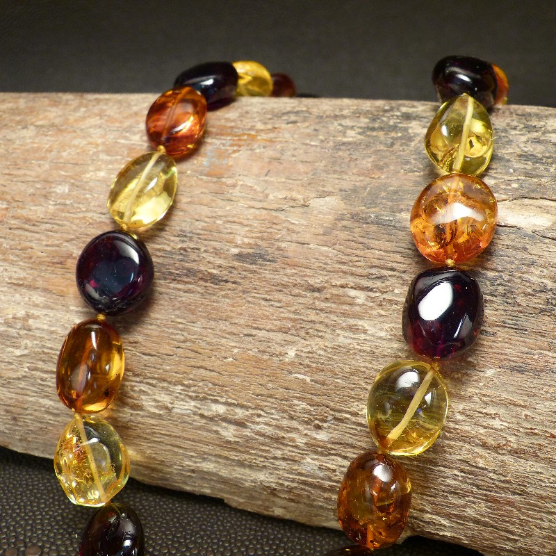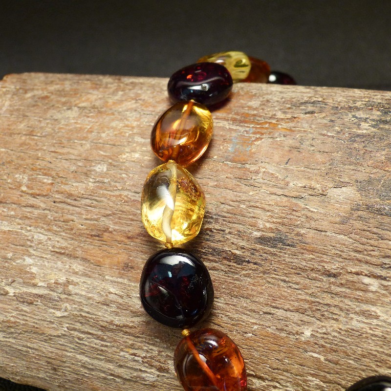 In unregelmäßiger Form geschliffene Kette aus Naturbernstein mit unterschiedlichen Färbungen in einer Länge von ca. 47cm. Die