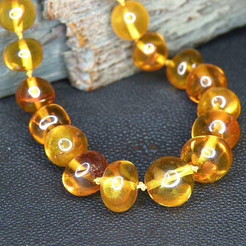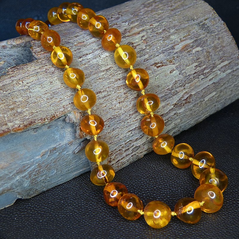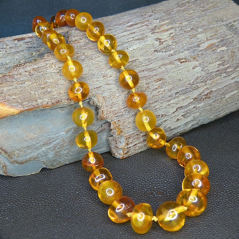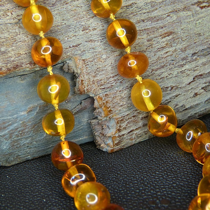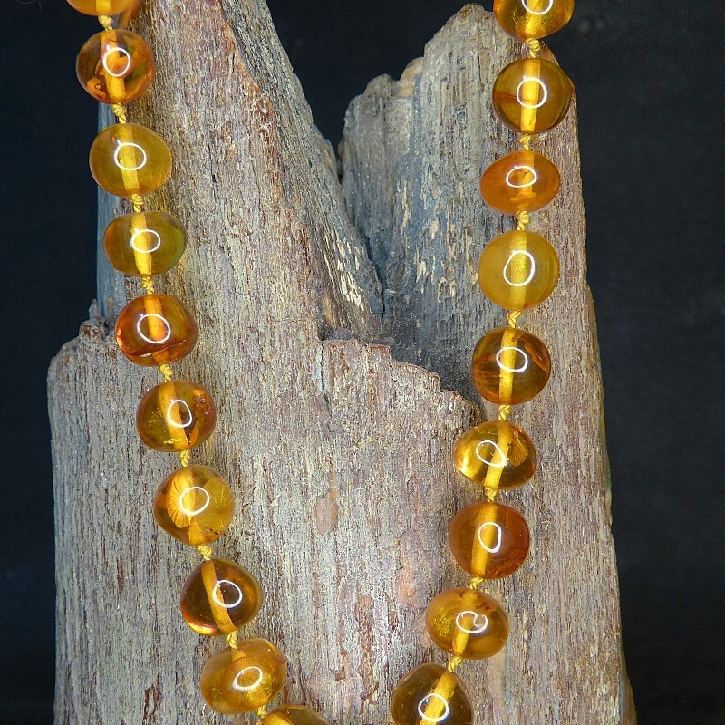 Naturbernsteinkette, einzeln geknotet und bestehend aus rundlichen, von Hand geschliffenen Kugeln mit einem Durchmesser von ca. 15mm in der Mitte, verlaufend bis auf ca. 9mm am Ende.