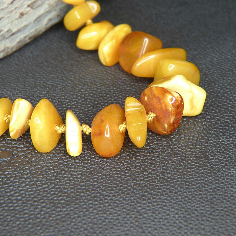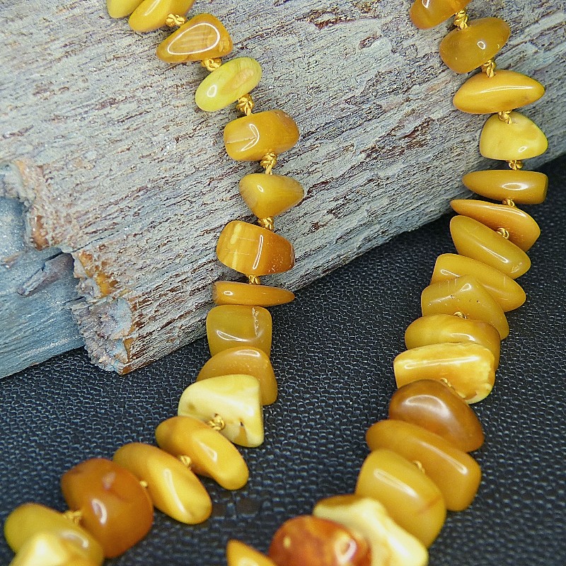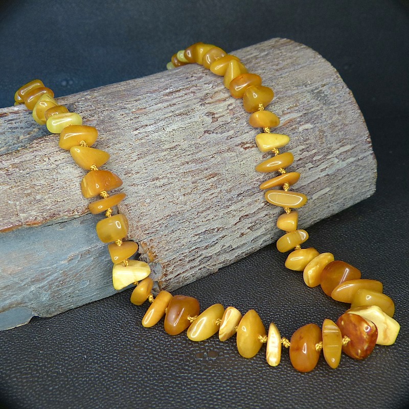 In unregelmäßiger Form geschliffene Kette aus einzeln geknoteten milchigen Naturbernsteinen mit unterschiedlichen Färbungen in einer Länge von ca. 62 cm.
