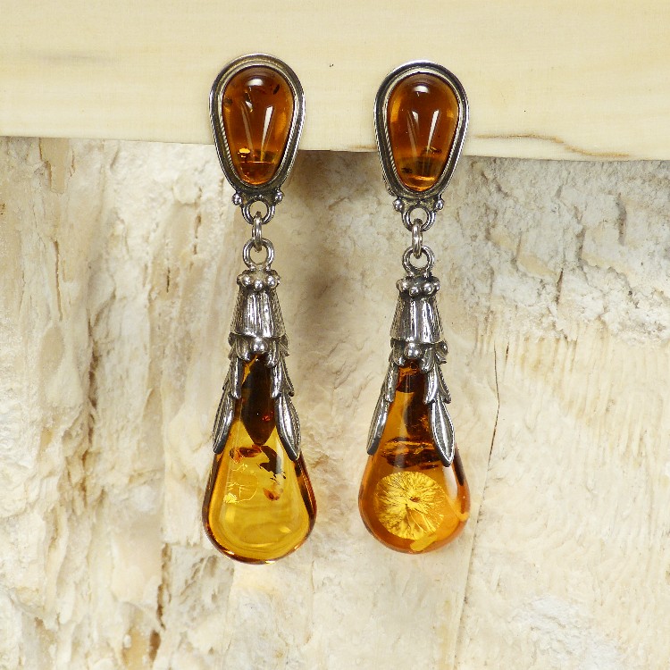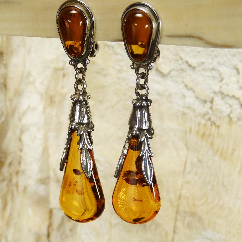 Für die Clipträgerin gefertigte Ohrhänger aus echtem cognacfarbenem  Naturbernstein, gehalten in einer schön ausgearbeiteten 925/-er  Silberfassung. Die Gesamtlänge beträgt ca. 55mm.
