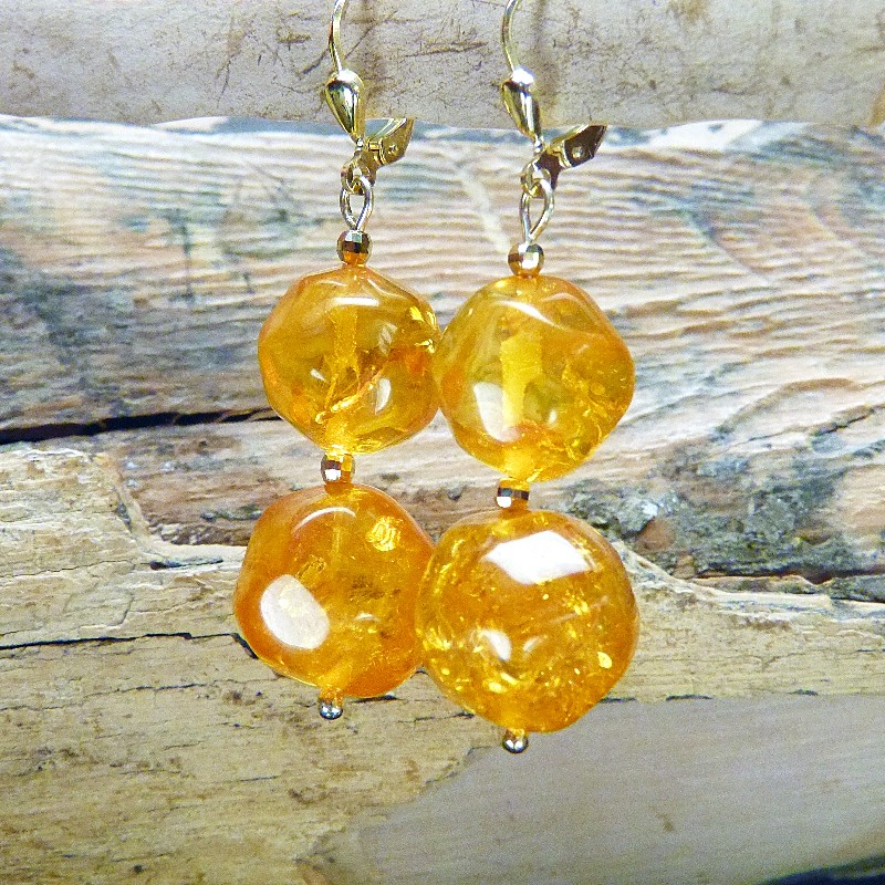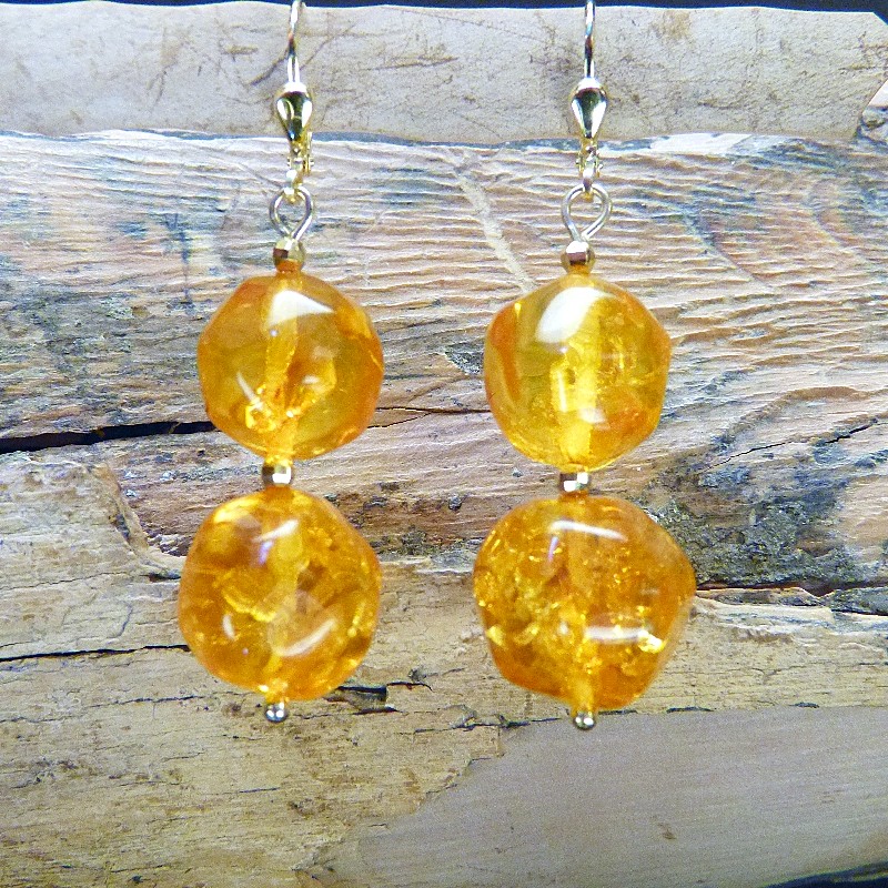 Hängeohringe mit handgeschliffenen Kugeln aus Naturbernstein in einem Durchmesser von ca. 14-16mm.