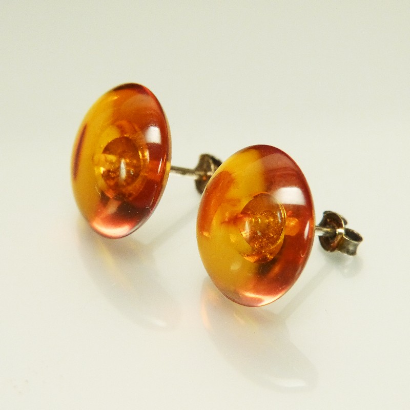 Ohrstecker aus cognacfarbenem Naturbernstein mit einem Durchmesser von ca. 16mm. Die Mechanik aus 925/-er Silber wurde für einen guten Halt gestiftet und geklebt.