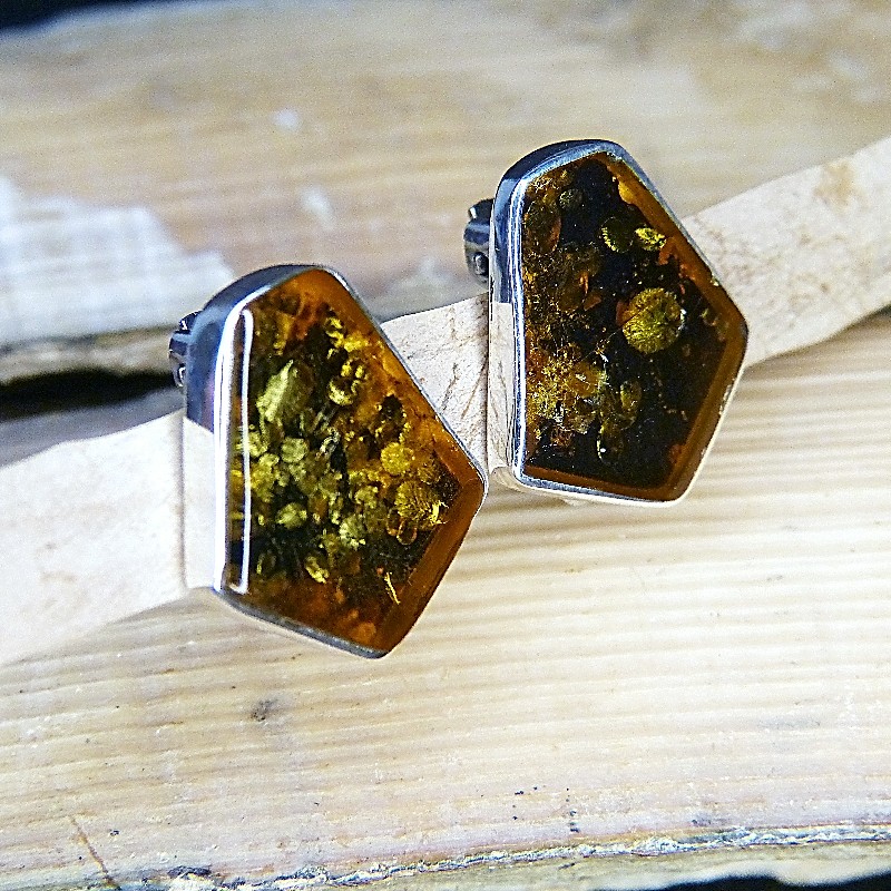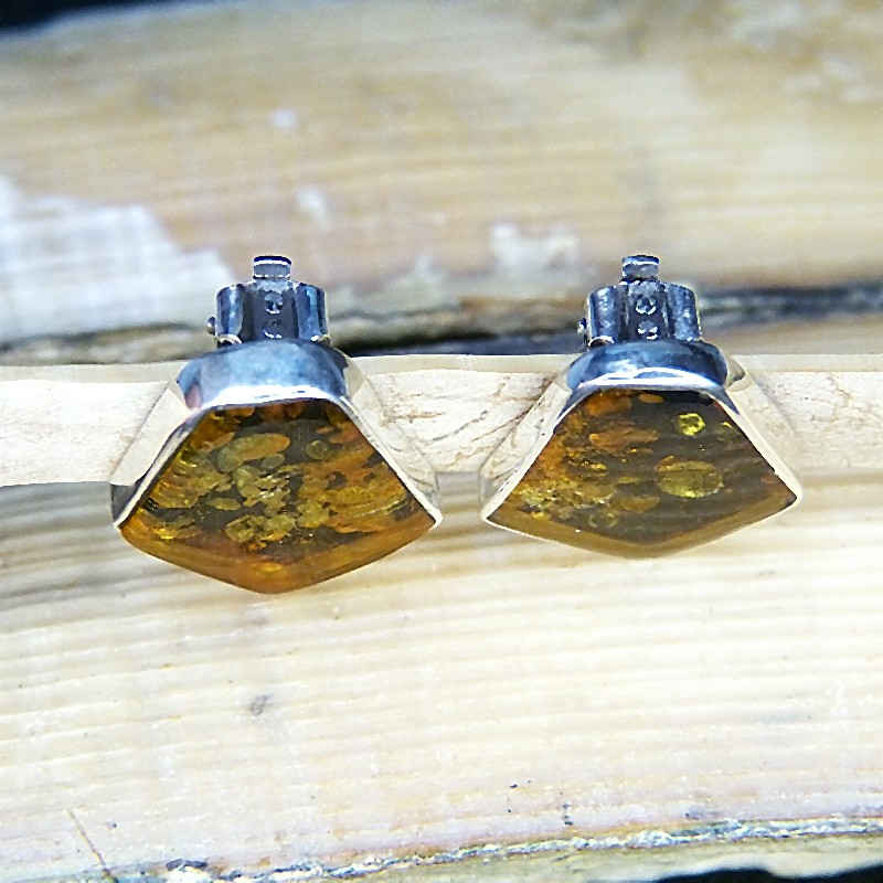 Ohrclipse aus 925/-er Silber mit eingeschliffenen Naturbernsteinen mit vielen Einschlüssen.