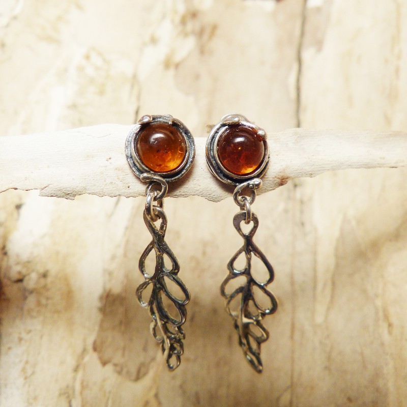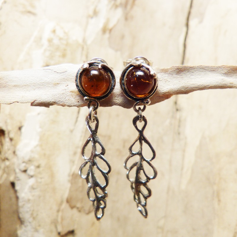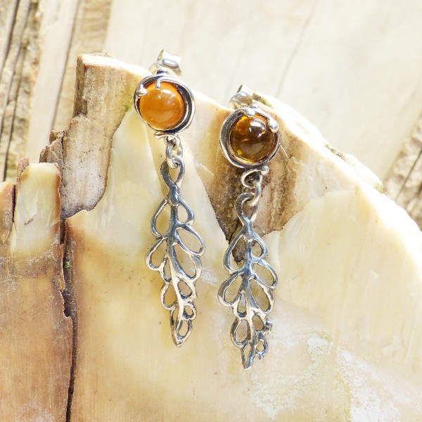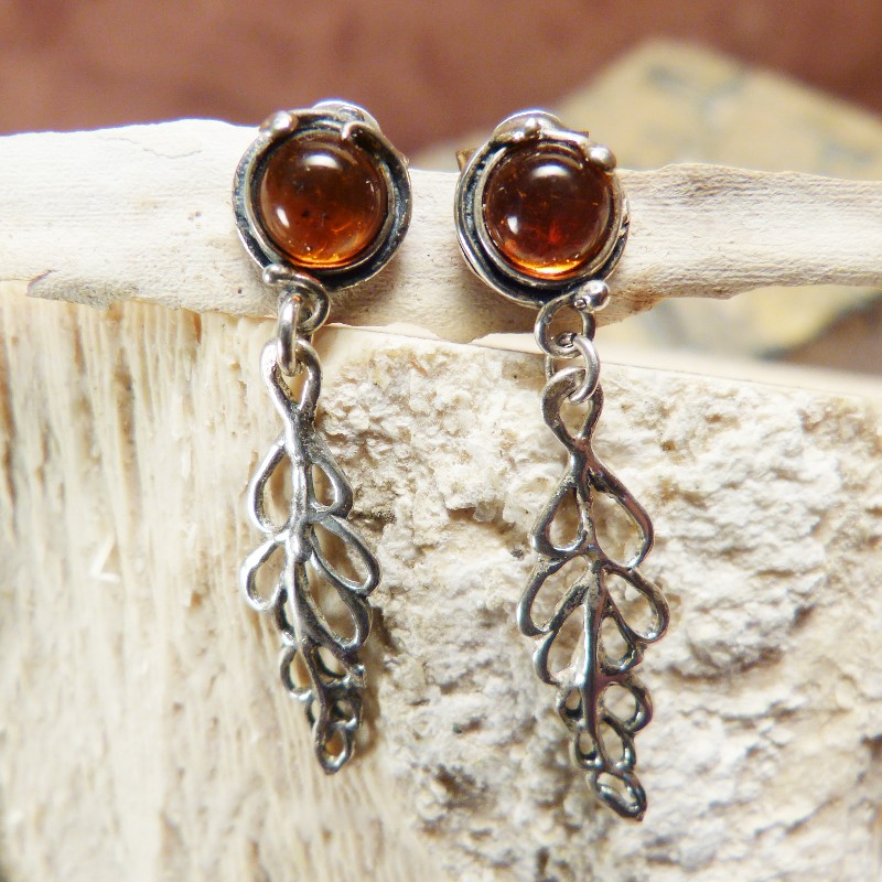 Antiksilberne (925/-) Ohrhänger mit Steckermechanik und echtem Bernstein in der Größe von ca. 6 mm. Die Ohrringe selbst haben eine Länge von ca. 35 mm. Da es sich hierbei um Naturbernstein handelt, fällt jedes Paar individuell aus.