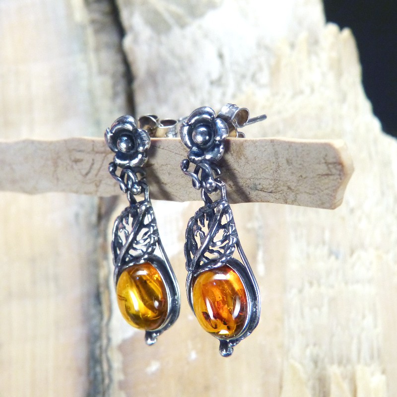 Antiksilberne (925/-) Ohrhänger mit Steckermechanik und echtem Naturbernstein in der Größe von ca. 8x10 mm.