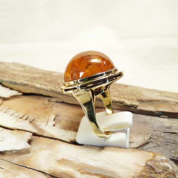 Toller auffälliger Ring aus 333/- Gold mit hohem Cabochon aus Naturbernstein mit vielen Einschlüssen. Die elegante und hochwertig gearbeitete Fassung hat eine Größe von ca. 27 x 24 mm. Der Stein ragt etwa 17 mm über dem Finger auf und gibt dem Ring so das besondere Etwas. Die Ringschiene hat oben eine Breite von ca. 7,3 mm und verjüngt sich nach unten auf ca. 2,7 mm. Die Weite beträgt im Durchmesser 18,3 mm was etwa der Größe 57,5 entspricht.