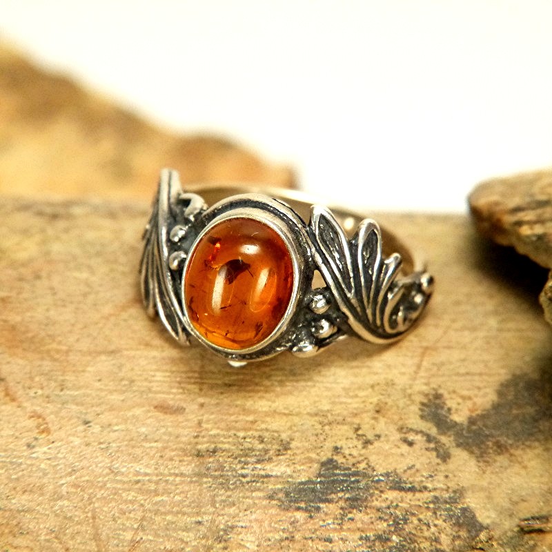 Ring aus 925/-er Silber im Antikfinish mit einem ca. 8 x 10 mm großen Cabochon aus echtem cognacfarbenem Naturbernstein.