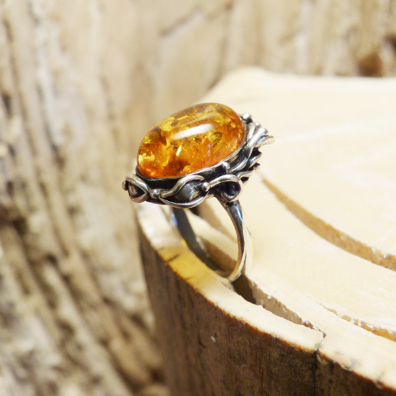 Ring aus 925/-er Silber in Antikfinish und einer Größe von ca. 18,5 x 15 mm. Die verspielte Fassung ist um einen ca. 10 x 14 mm großen Naturbernstein mit schönen Einschlüssen gearbeitet. Ringweite 16,5 mm.