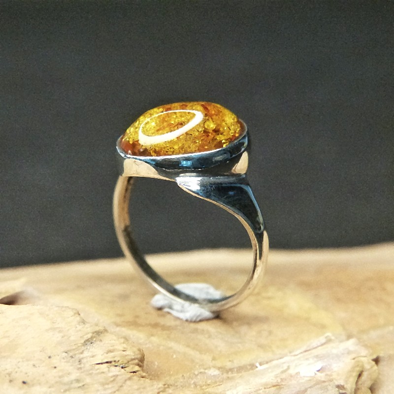 Ring aus 925/-er Silber mit einem schräg angeordneten ca. 10 x 14mm großen Cabochon aus Naturbernstein mit vielen Einschlüssen.