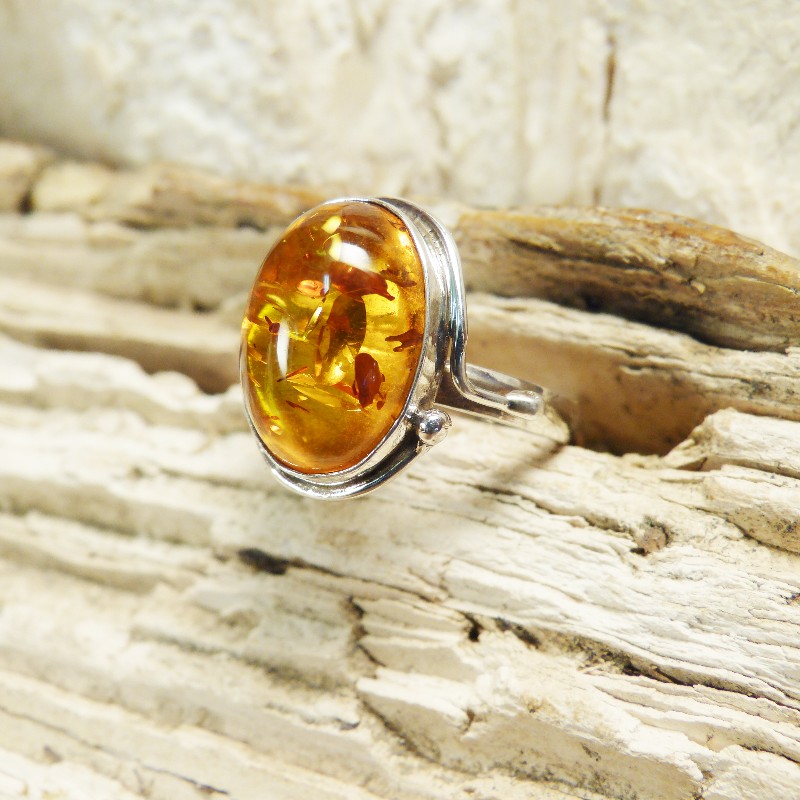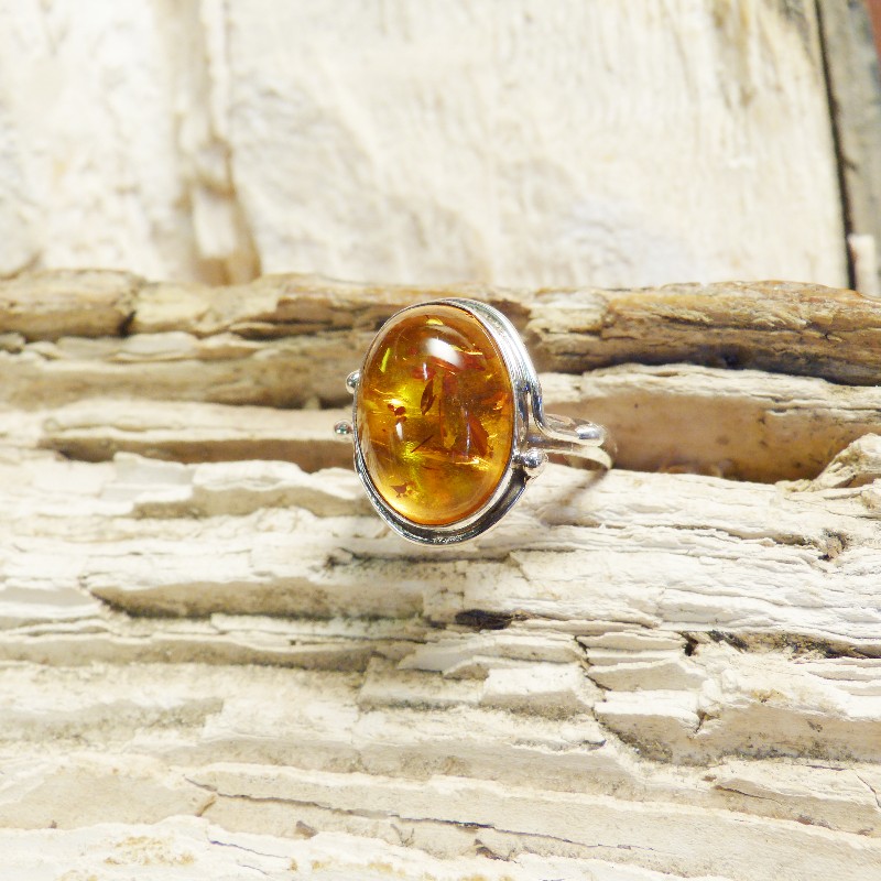 Ring aus 925/-er Silber in einer Größe von ca. 18 x 16 mm. Die verzierte Fassung ist um einen ca. 11,5 x 15,5 mm großen Naturbernstein mit schönen Einschlüssen gearbeitet. Ringweite 17,5 mm.
