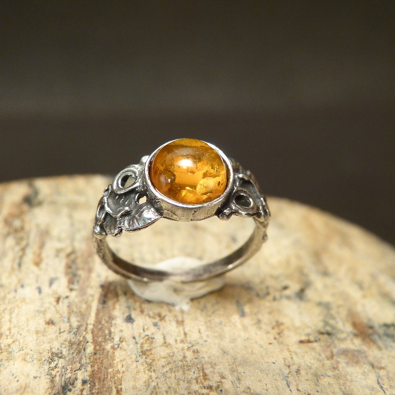 Ring aus 925/-er Silber im Antikfinish mit einem ca. 8 mm großen Cabochon aus echtem Naturbernstein.