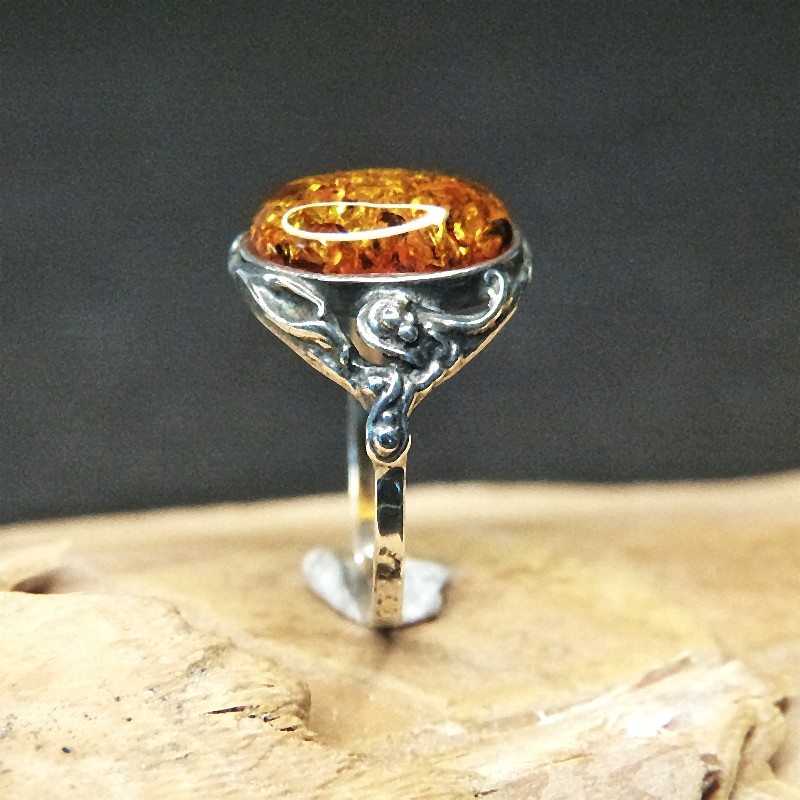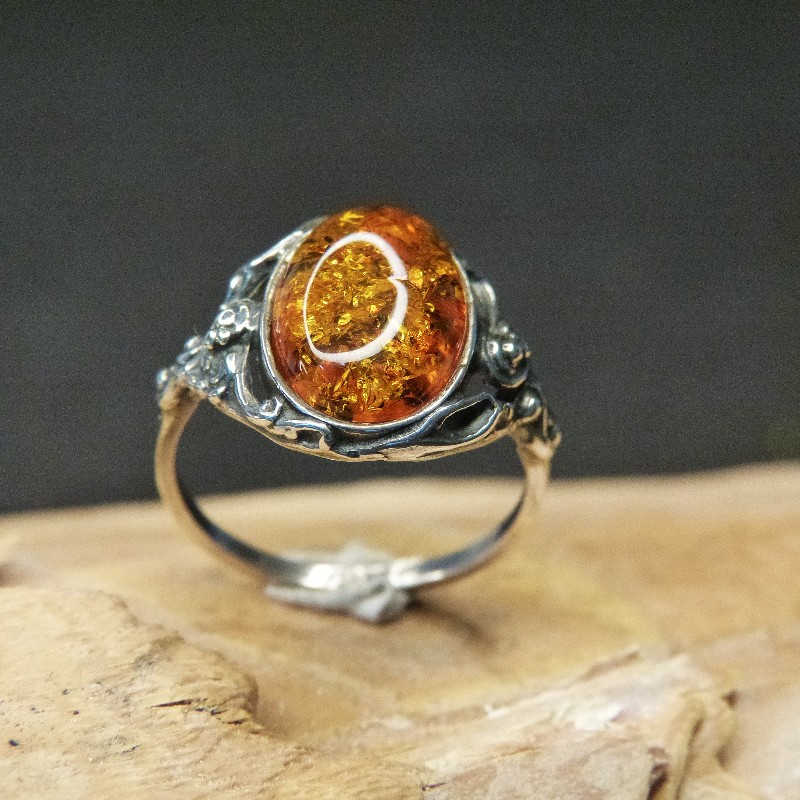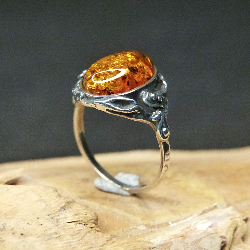 Ring aus 925/-er Silber im Antikfinish mit einem ca. 14 x 10 mm großen Cabochon aus Naturbernstein mit vielen Einschlüssen.