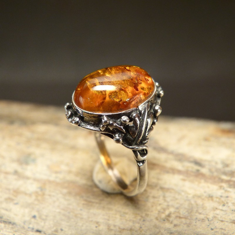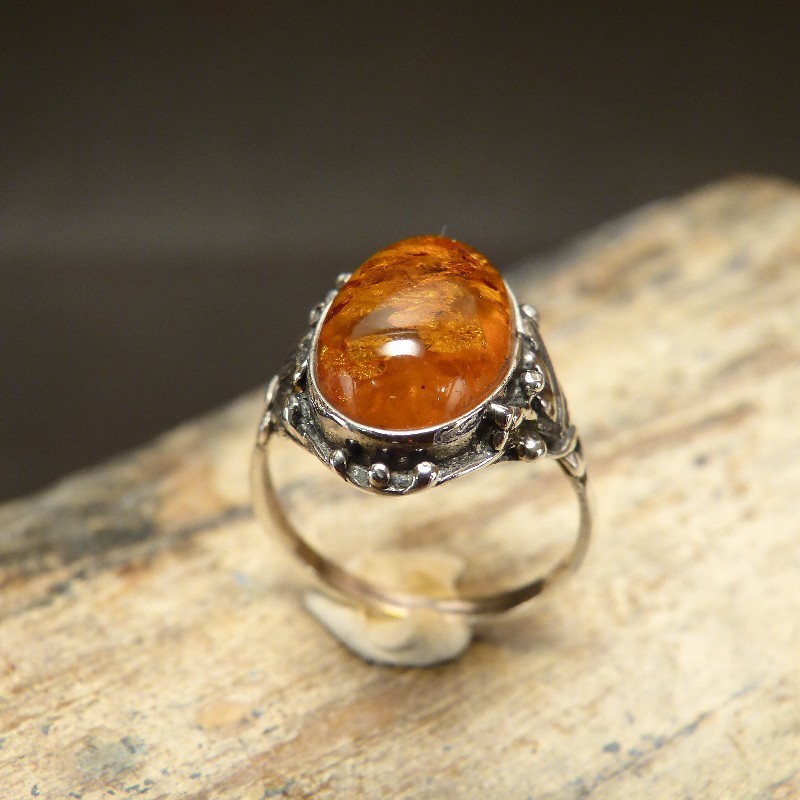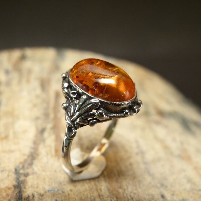 Ring aus 925/-er Silber im Antikfinish mit einem ca. 14 x 10 mm großen Cabochon aus echtem Naturbernstein. Da Bernstein ein Naturmaterial ist, können Färbungen oder Einschlüsse von der Abbildung leicht abweichen.