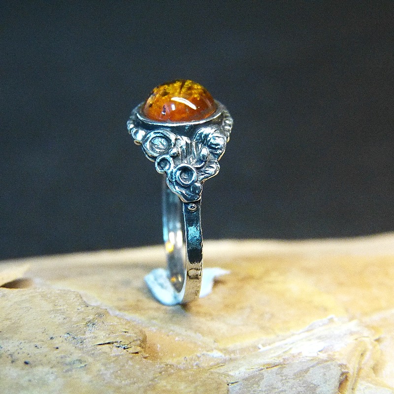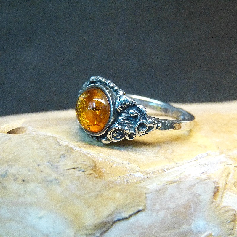 Ring aus 925/-er Silber im Antikfinish mit einem ca. 8 x 10 mm großen Cabochon aus Naturbernstein.