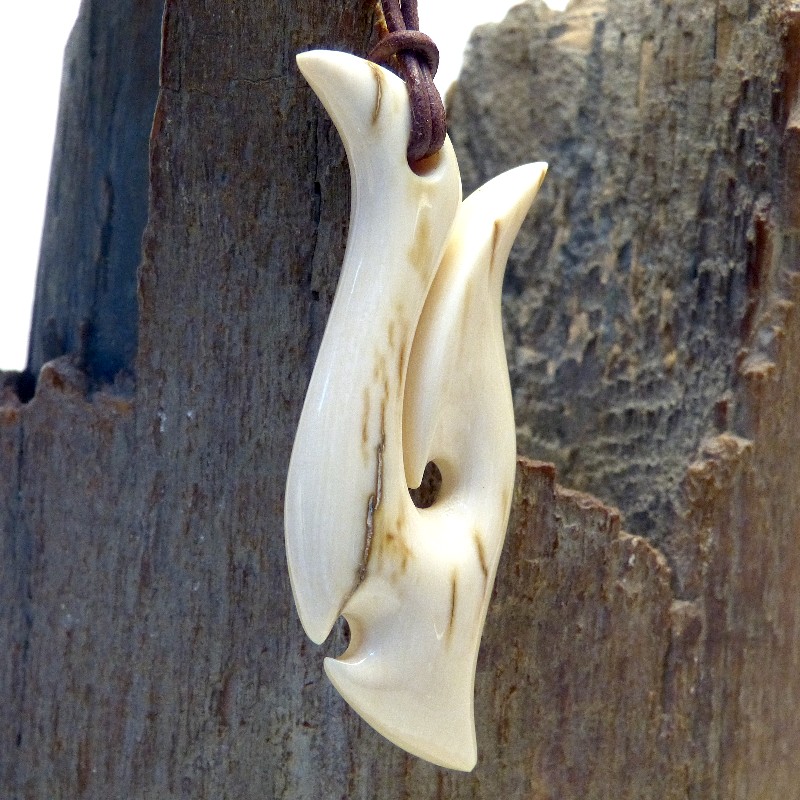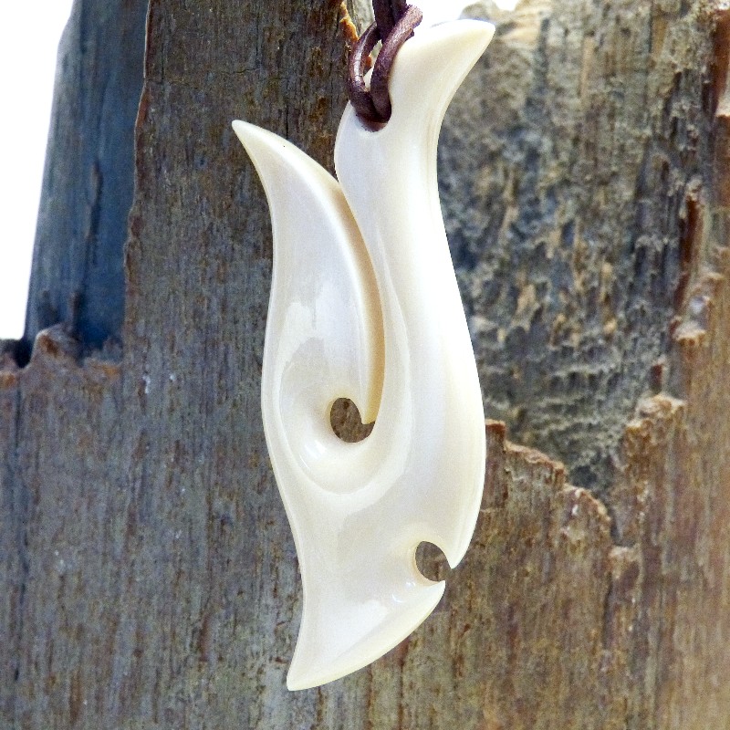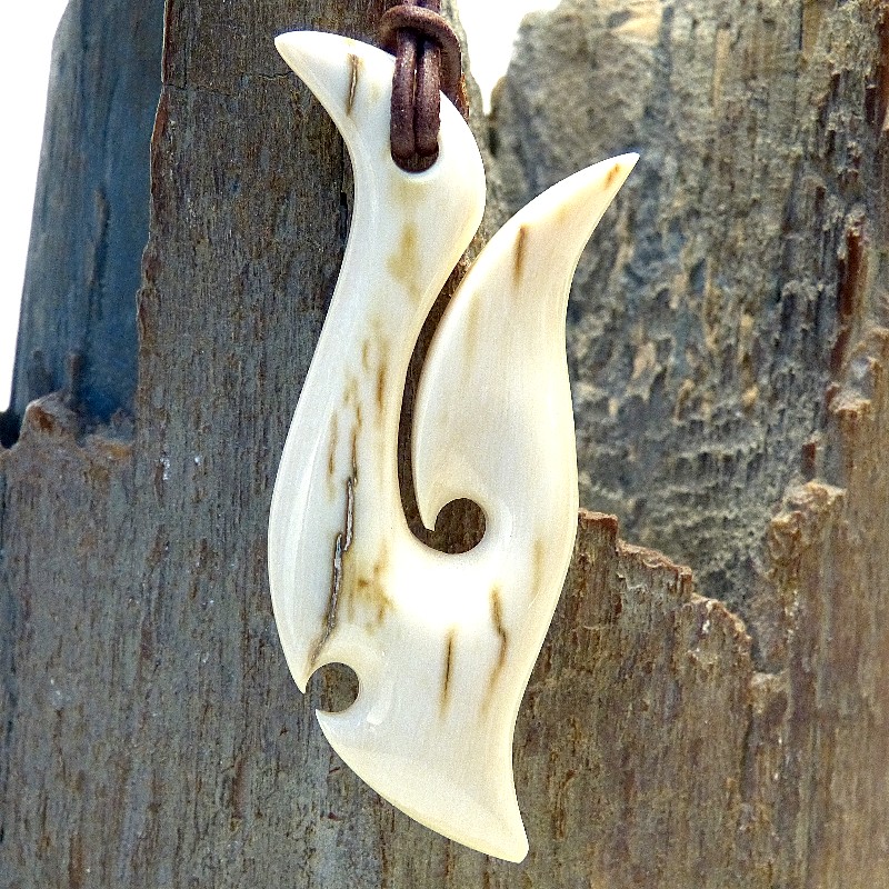 Großer stilisierter Angelhaken als Anhänger, wie ihn die Ureinwohner Neuseelands tragen, gefertigt aus cremefarbenem Mammut-Elfenbein mit bräunlicher Rindenfärbung in schöner plastischer Ausarbeitung.